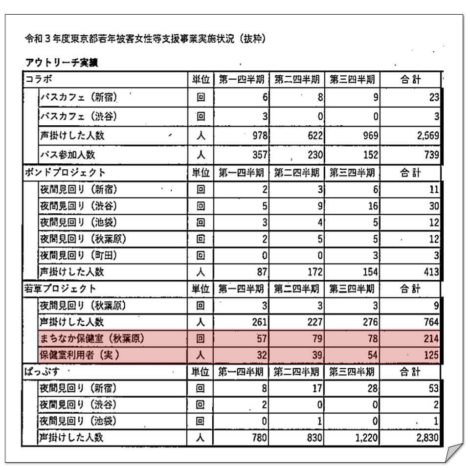 「深夜巡視」に変えて「常設の相談室」でも可となっている。令和3年度事業の評価委員会資料の各団体アウトリーチ実績は下表のとおりであり、若草プロジェクトだけが「常設の相談室」を実績計上している。実施要綱及び仕様書変更の恩恵を受けたのは若草プロジェクトだけということになる。