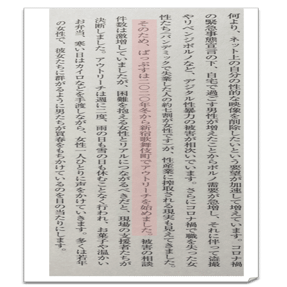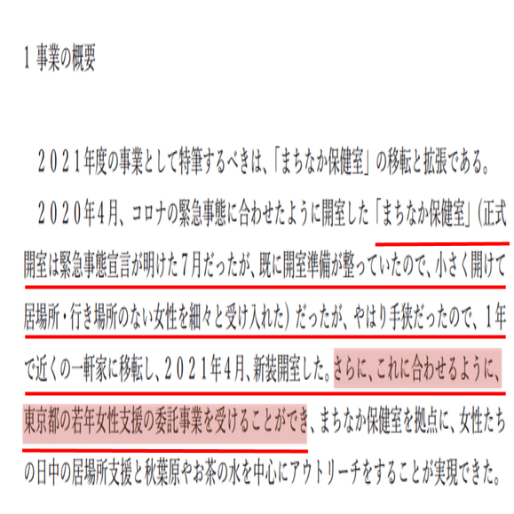 また、厚生労働省の実施要綱では「常設の相談所」の条件緩和はなされていない。性の被害は深夜発生する確率が高く、被害を水際で防止するたためには深夜のアウトリーチが必須だと考える。穿った見方かもしれないが、東京都は若草プロジェクトを加えるために事業全体のスコープを曖昧にしてしまったように思う。