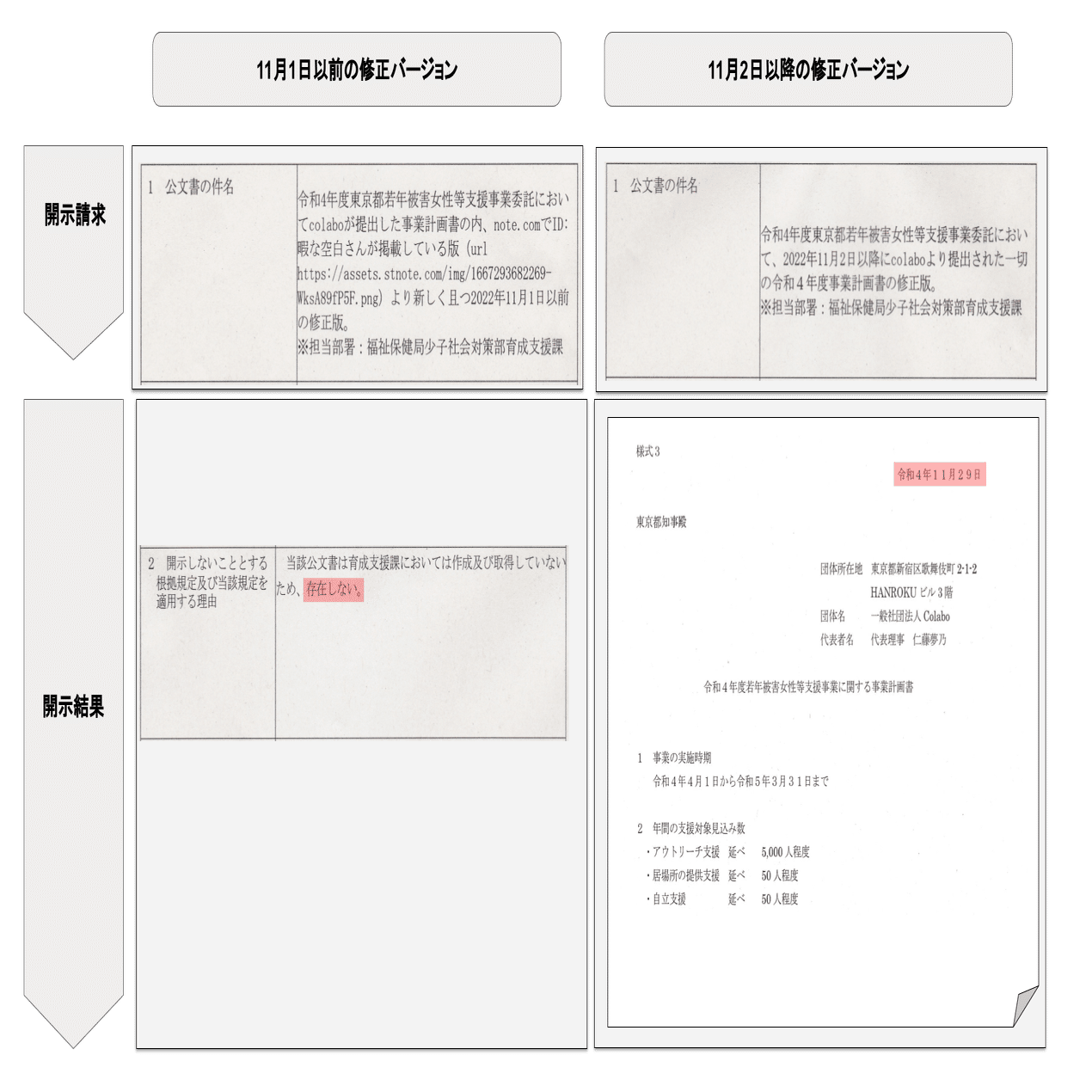 「暇空氏が新旧の複数バージョンの事業計画書を開示請求で取得しうるか」を明らかにするため、11月1日を境界にして2つの開示請求を行った。11月1日は暇空氏がnoteに令和4年度の事業報告書を公表した日である。新旧2つのバージョンを暇空氏が取得するには11月1日以前にcolaboから修正バージョンが提出されている必要がある。