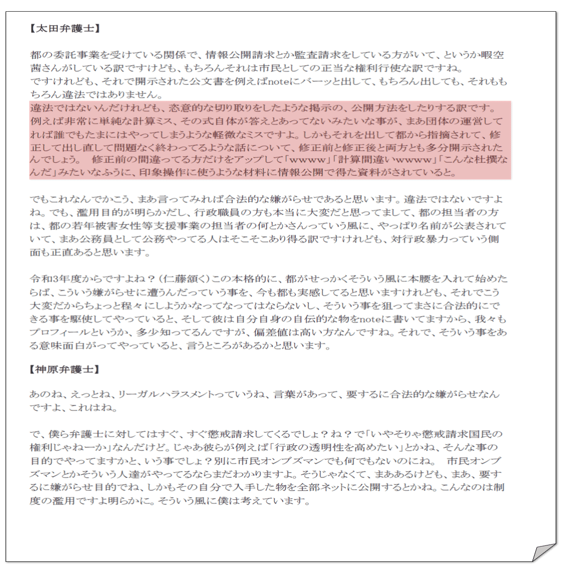 「リーガルハラスメント」が有名になった11月29日のcolabo弁護団の会見の議事録を改めて見てみる。太田弁護士が今回明らかになった虚偽をもって「合法的な嫌がらせ」と断じ、それを引き継いで神原弁護士の名言「リーガルハラスメント」が出てくる。ここまで相手を非難するのであれば尚更のこと慎重な事実確認が必要だったのではなかろうか。