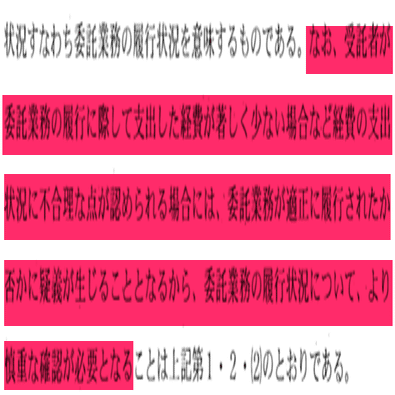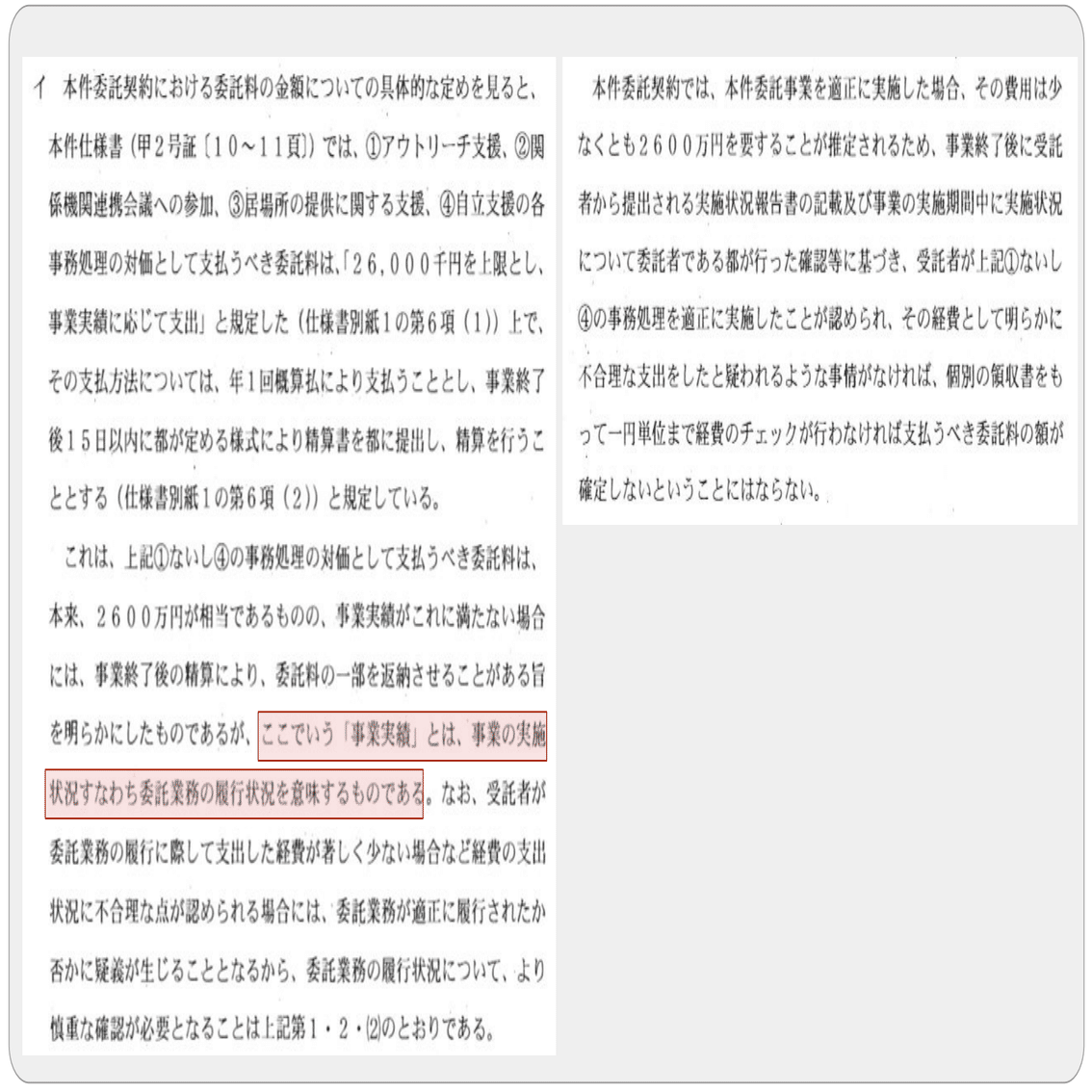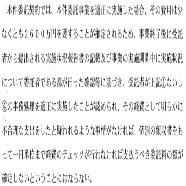 手を抜けば数時間で作成可能な数枚の実施状況報告書自体に2,600万の価値はなく、事業実績を反対給付とするのであれば、事業の内容ごとに数量を明確にした価格(例えば夜間のアウトリーチ1回あたりの価格)を見積、積算を通じて予め決定しておかなければならない。仮に夜間のアウトリーチ1回あたりの価格が決定されていれば、1週間に1回程度の仕様に満たないColaboの実績では必然的に減額されることになる。準委任契約でも事業の実績と支払額を連動させることによって、適切な履行や価格を担保する必要がある。