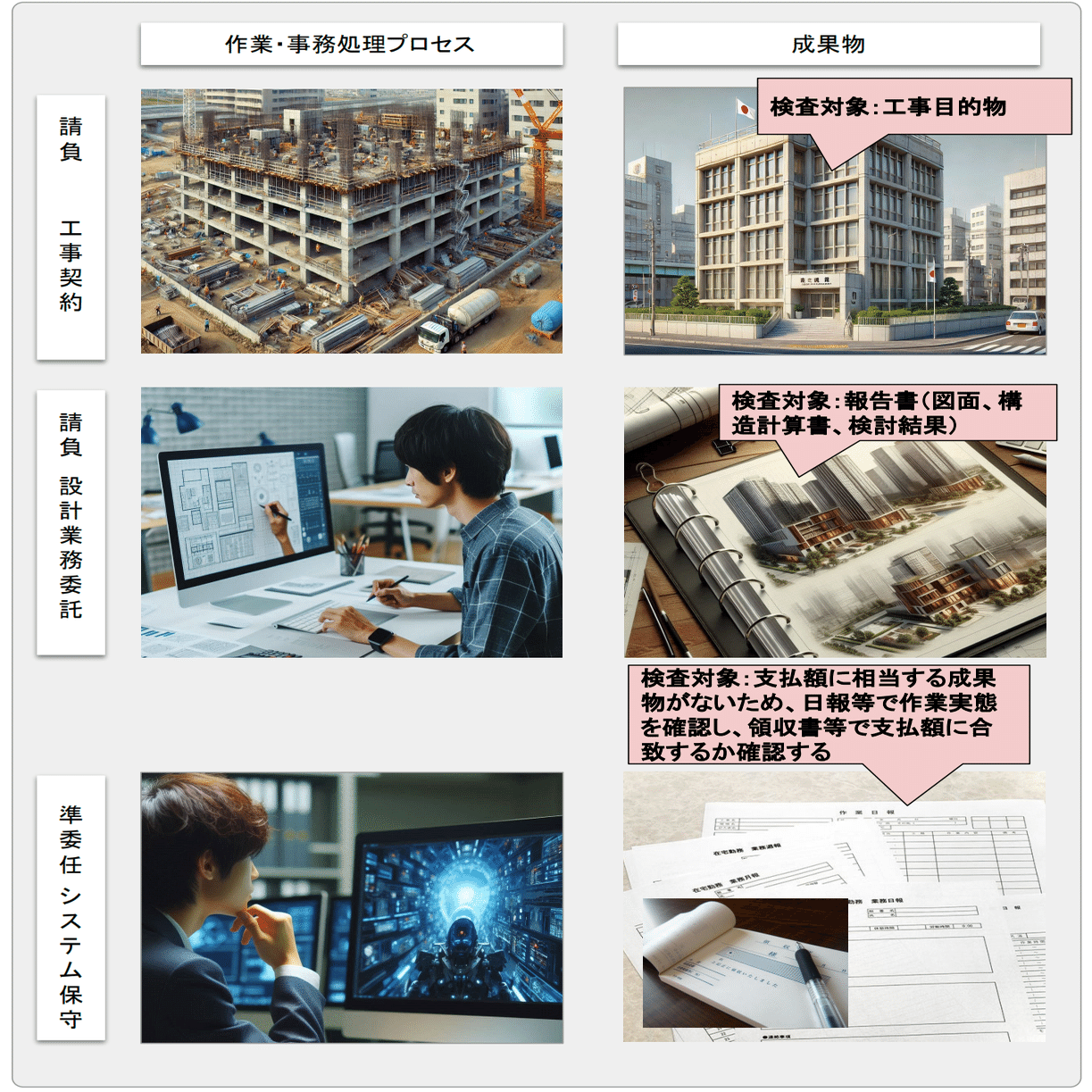 公共発注機関からの発注の基本は請負契約である。請負契約は発注者が提示する仕様にそった成果物を完成させ納品する契約である。例えば建設工事では、目的物の諸元、図面、材料を仕様として提示し、請負者が仕様どおりの建設物を施工し納品する。また、完成後では確認できない配筋や地盤等は施工途中に確認したり、写真等による管理状況を確認する。設計業務の契約でも発注者は必要な図面の種類や構造計算等を提示し、それを受託者が実施して報告書として取りまとめて検査を受ける。これら請負の契約では工事目的物や報告書といった成果物が検査の対象である。支払いと等価の成果物があるため、経費を検査することはない。標準的な業者がやれば1億かかる工事を工夫で5千万に抑えて利益をあげても問題はない。