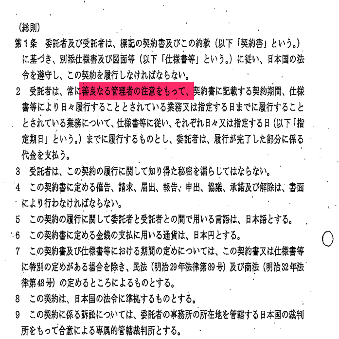 参考までに請負契約である東京都建築設計委託契約書の総則を以下に示す。善良な管理者の注意義務ではなく、成果物の完成・引き渡しを約す契約となっていることがわかる。