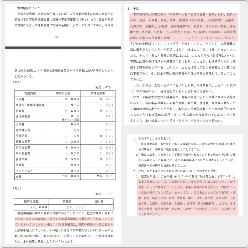 また、監査報告書においても監査対象局(福祉保健局)及び監査事務局は実績額を評価し、更には監査事務局が「事業の必要経費を正確に報告させる」ように注意をしており、事業実績と支払額を連携させてない。