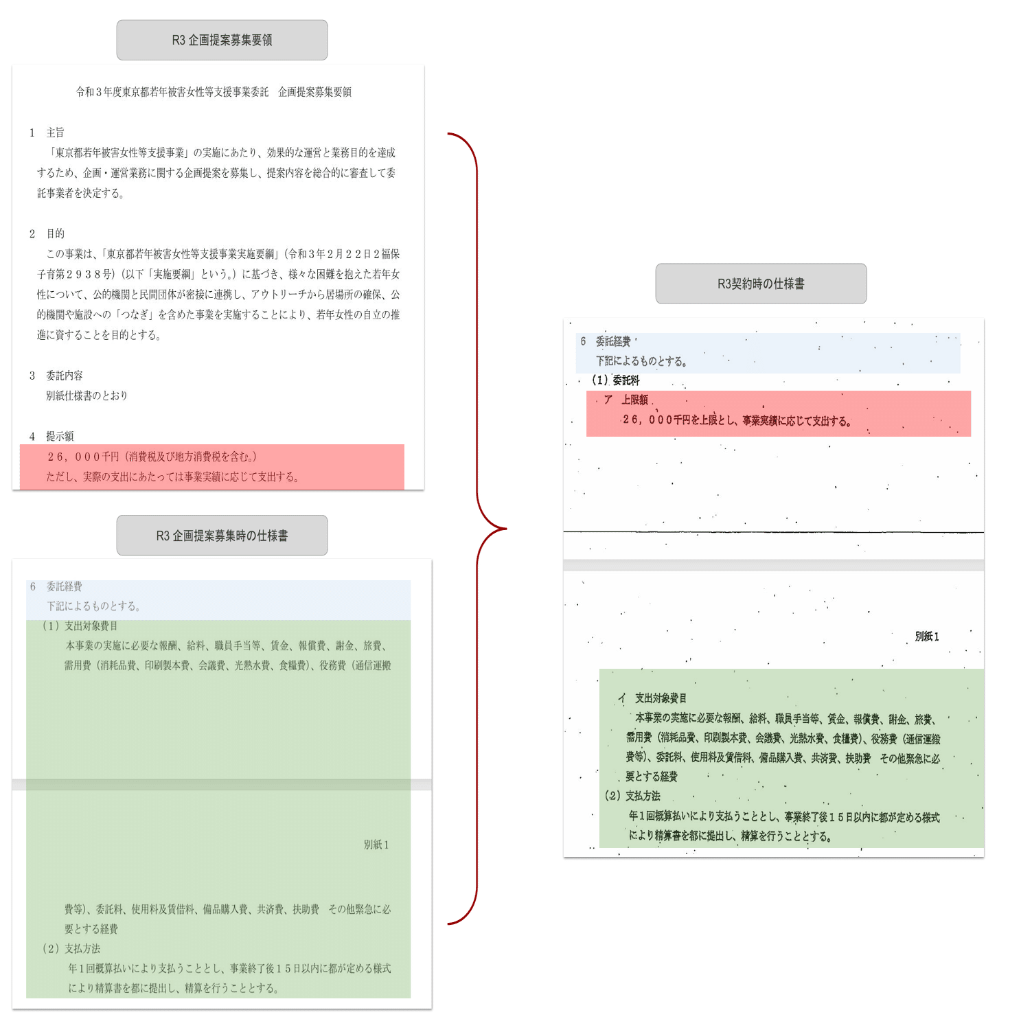 このことは、企画提案公募時の募集要項と仕様書からも明らかである。公募段階で仕様書は「経費」を対象に支払うとしており、募集要綱において経費が2600万未満の場合は経費分のみを払うという意図で「事業実績」を用いている。