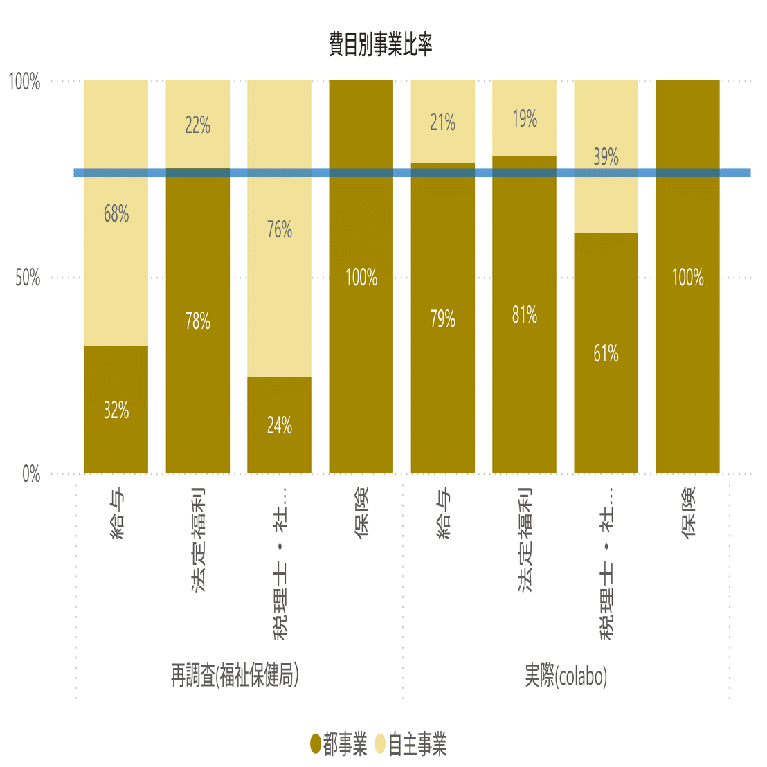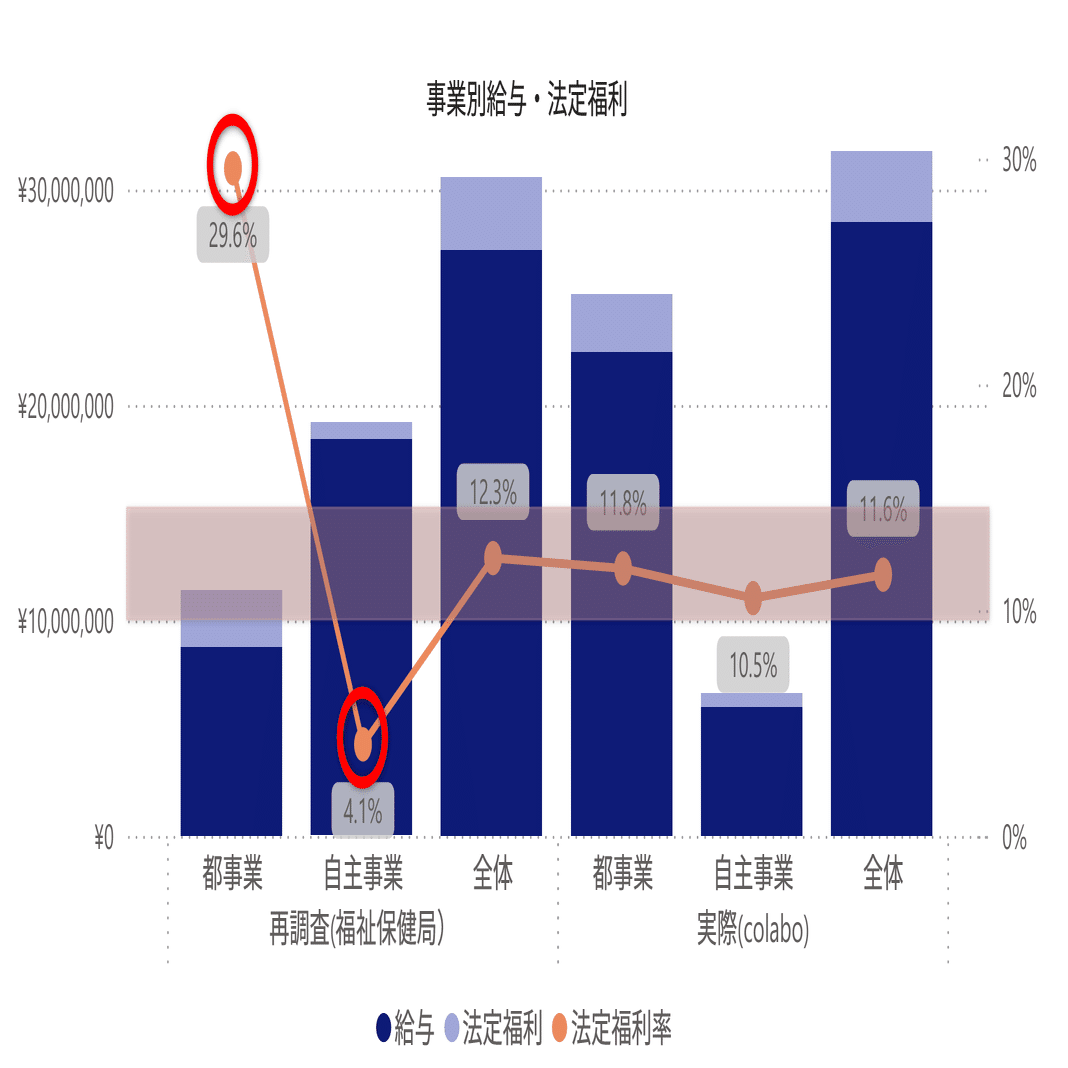 colaboが裁判に提出した「実際」も加えて、都事業、自主事業別に給与と法定福利及び給与に対する法定福利の比率を以下に示す。
