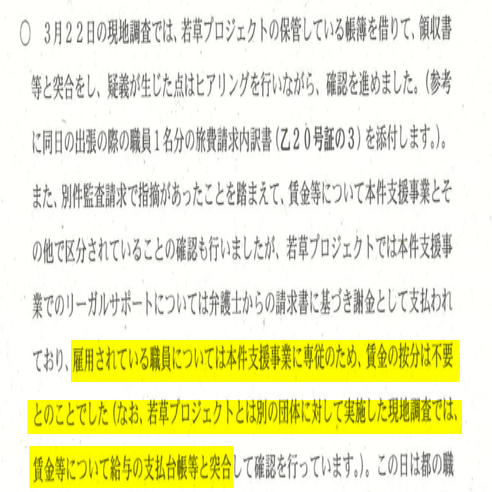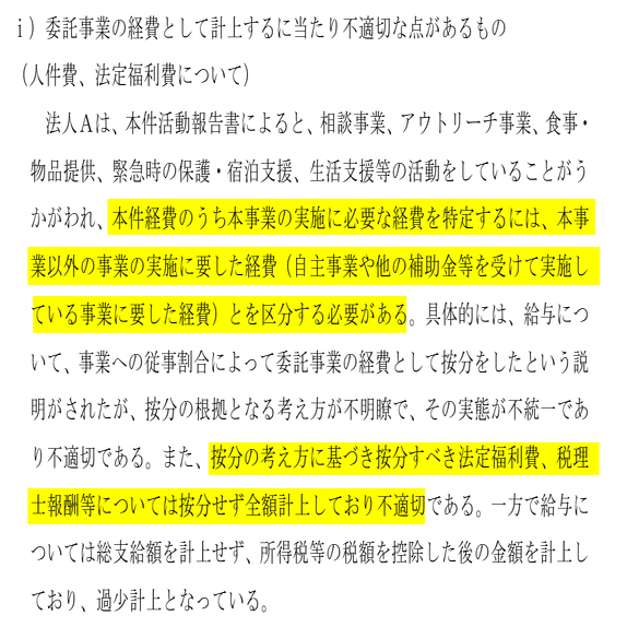 法定福利は給与の割合から算出されることから、両者の事業別の割合はほぼ同じになる。また、税理士・社労士も都事業と自主事業で按分したとのことであり、これも給与の割合に準じるはずである。福祉保健局の再調査では給与と法定福利の事業割合が全く異なっており、都事業の法定福利は78%に達している。colaboは仁藤氏の講演活動やcolaboの管理の他に「中長期シェルター」を自主事業とし長期保護者の自立支援計画も提出してない。これら自主事業が22%とは考え難く自主事業と都事業の適切な案分がされてないと考える。