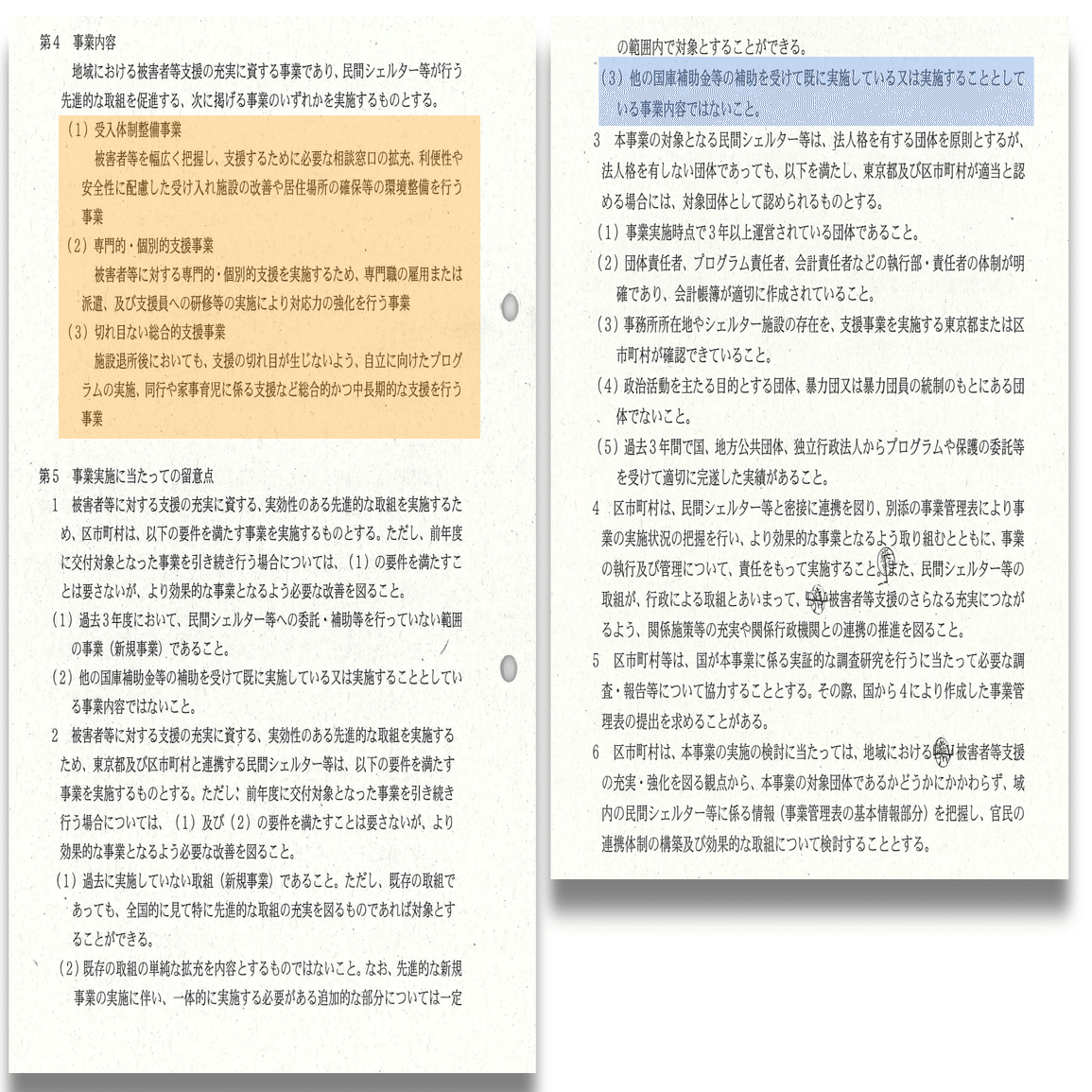 令和3年度東京都配偶者暴力被害者等セーフティネット強化支援交付金実施要綱(以下、「実施要綱」という)では他の国庫補助を受けてる事業内容ではないことを要件としている。併用禁止が「事業内容」を基準としていることが裁判上のポイントになっている。