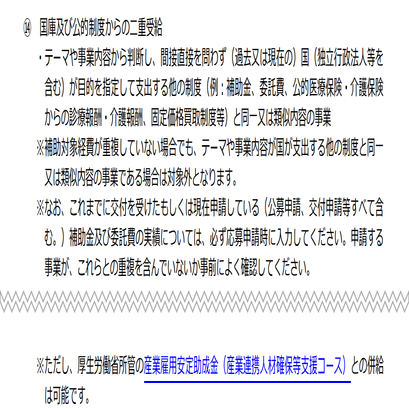 他の補助金における併用禁止の縛りと運用について以下に整理する。千差万別であり一概に併用禁止の対象は確定できない。