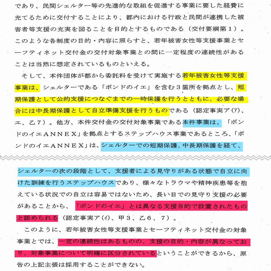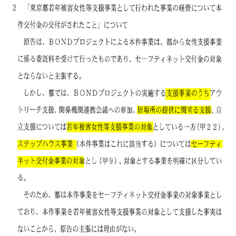 東京都の主張は「経費が重複してない」と「交付金のステップハウスと支援事業のシェルターは別事業」の2つである。しかし、判決では「経費が重複してない」は一切触れることなくステップハウスとシェルターは別事業として補助金の併用ではないとした。