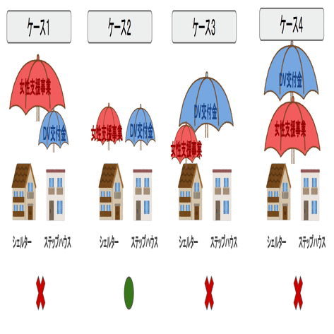 シェルターは自立までの保護女性支援、ステップハウスは保護女性の自立後の支援であることから事業の内容が異なっていると判断したものと思われる。DV交付金・支援事業とステップハウス・シェルターの考えられる組み合わせを以下に整理する。