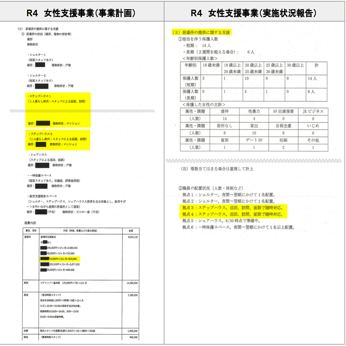 また、R3の若草ハウスの経費が女性支援事業に紛れ込んでいたのかは不明であるが、R4は若草ハウスの費用を女性支援事業の枠で取得している。
