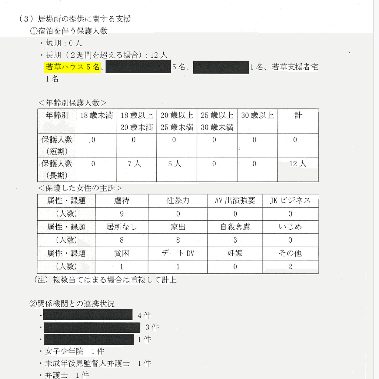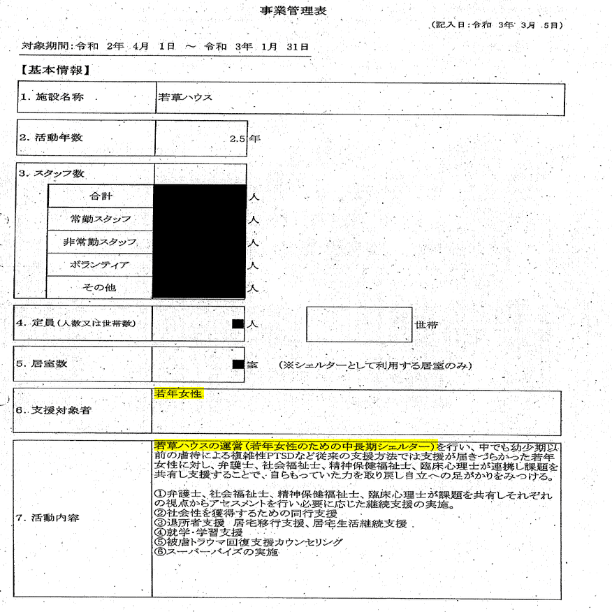 この若草ハウスは同じ令和3年の女性支援事業の活動報告にも記載されており、事業内容での活動の区別はされていない。