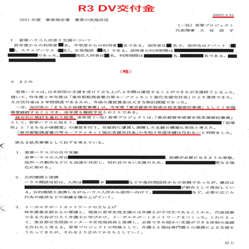 以上より、ステップハウスとシェルターの経費の手当ては事業目的も内容も関係なく、支払条件とBONDの事情によってDV交付金と女性支援事業のサイフを切り替えているだけと考えざるをえない。