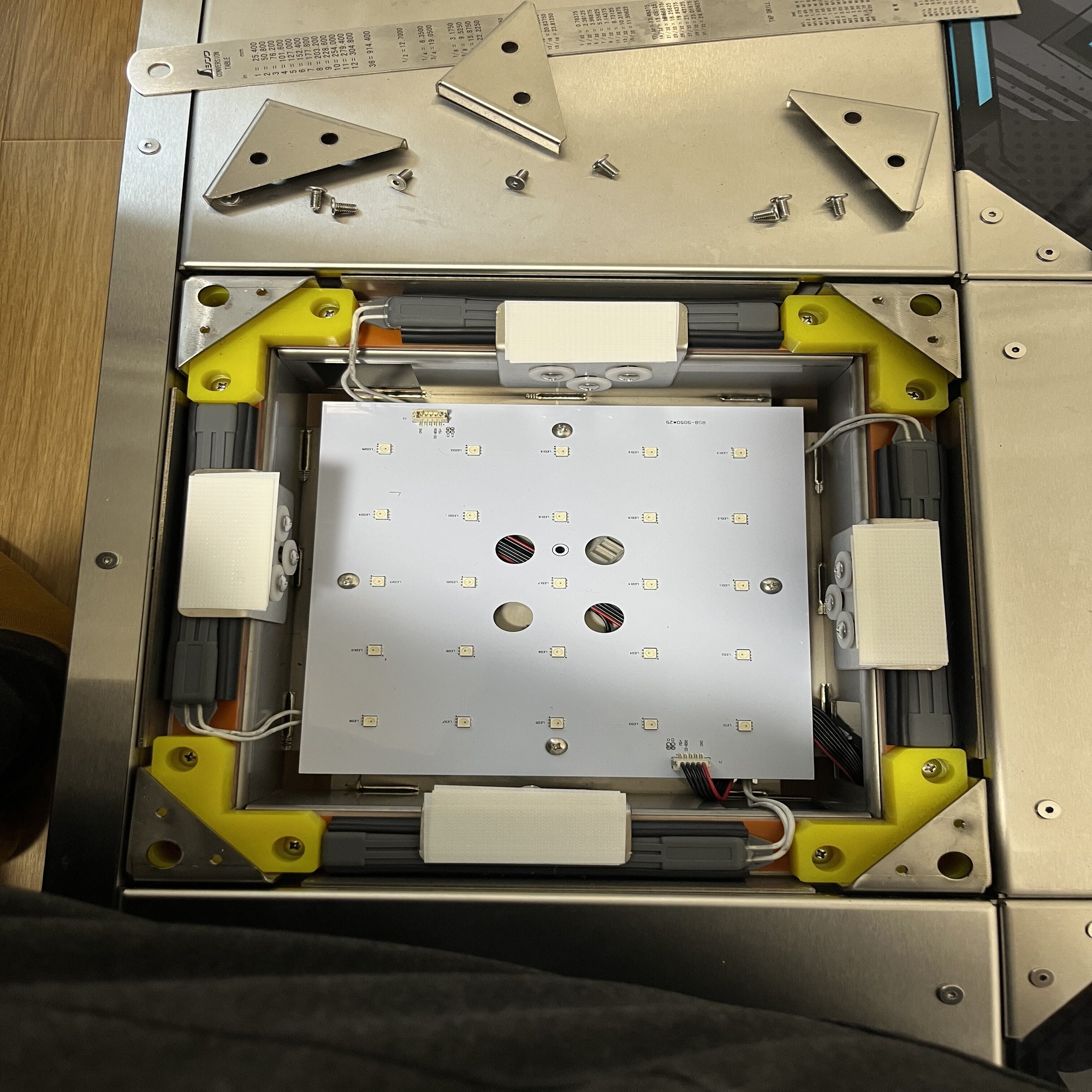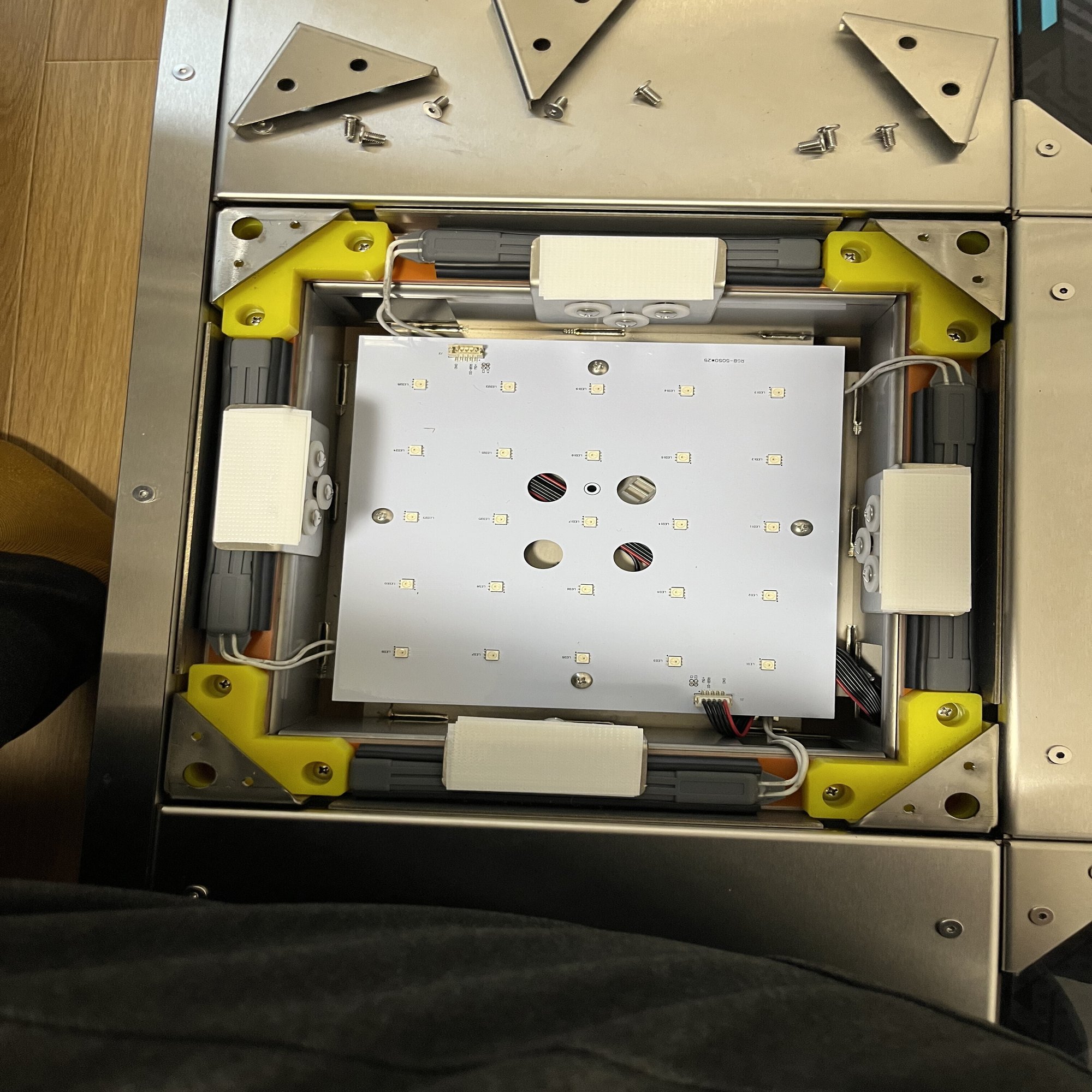 4x4=16個のセンサーの上にある金属板に養生テープなどを重ね貼りすることでセンサーの高さを底上げし、センサーとパネルが実質的に近づくことで、強く踏まなくても反応するようになるというメンテです。
