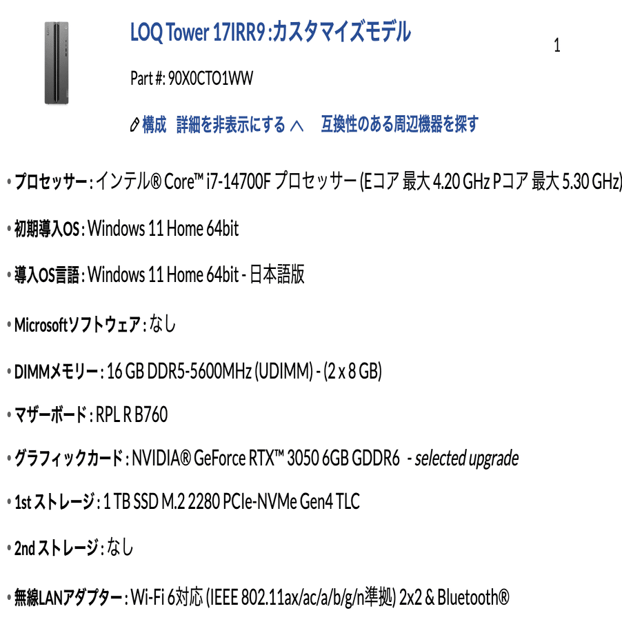 色々考えて、LenovoのLOQ Tower 17IRR9を購入しました。