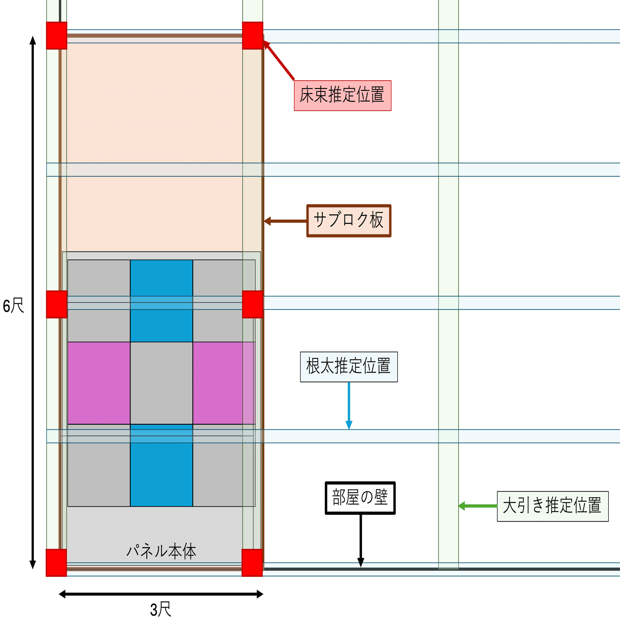 そこで石膏ボードなどを貼って壁を分厚くすることを考えましたが、壁を厚くするとサブロク板が上記の床束の位置から外れてしまう・遠くなる可能性があるため、"防音"は断念しました。