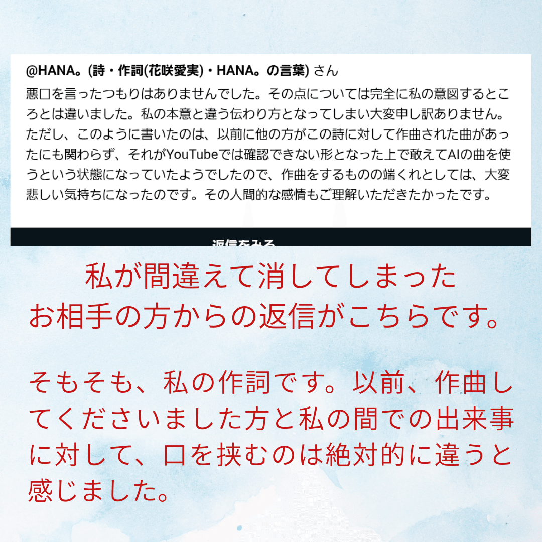 「本意と異なる伝わり方をしてしまったことについての謝罪につきましては先ほど書いた通りです。ただし、私は詩を侮辱は一切しておりません。そもそも私は詩の評価はできません。『(Suno AIにより作曲された本曲は)悪くない曲だが、いわゆる「曲先」(の曲)に見られるような、歌詞を尊重していない(ような音楽だという)感触を受けました』という意味です。その点は全く事実と異なりますので、詩に関しては侮辱をしていないというよりそもそも一切触れていない、ことにつきましてはこちらに弁明させていただきます。重ね重ねになりますが、誤解を生じさせる私の言葉足らずにつきましては誠に申し訳ありませんでした。」
