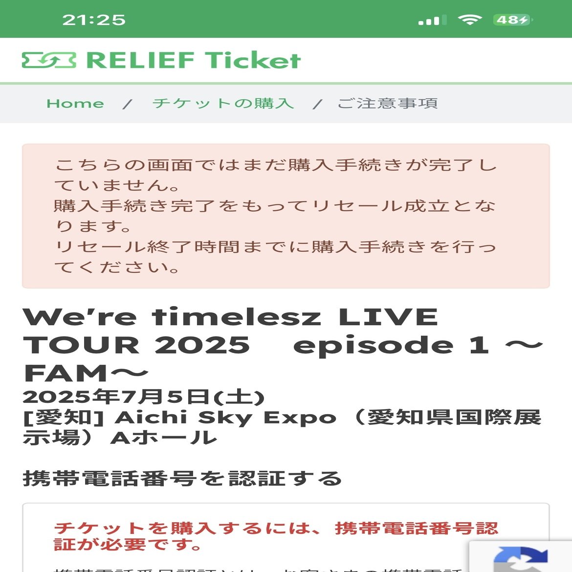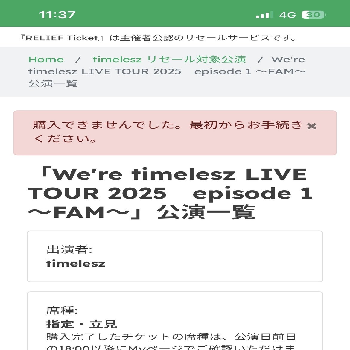 ①リロードしまくったら奇跡が起こり以下のようにグレーの文字が黒になりお席の数が浮かび上がってきます。迷わず購入手続きへ(画像の場合1人の人はディレイ)