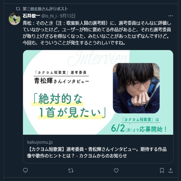(つまり、後付けのムーブメント発生後に見た人の想像するイメージとは違って、別にカクヨム短歌賞って読者がオープンに読みに参加して盛り上がるような建付けの賞だと最初から決まっていたわけではなかったし、応募要項にはむしろ真逆の内容を期待させることが書いてあったわけです)