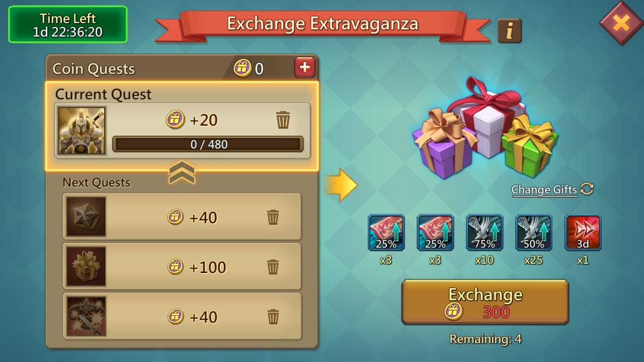 The Exchange Extravaganza is a periodic event in Lords Mobile, where quests can be completed to earn a number of valuable prizes within a 48 hour period