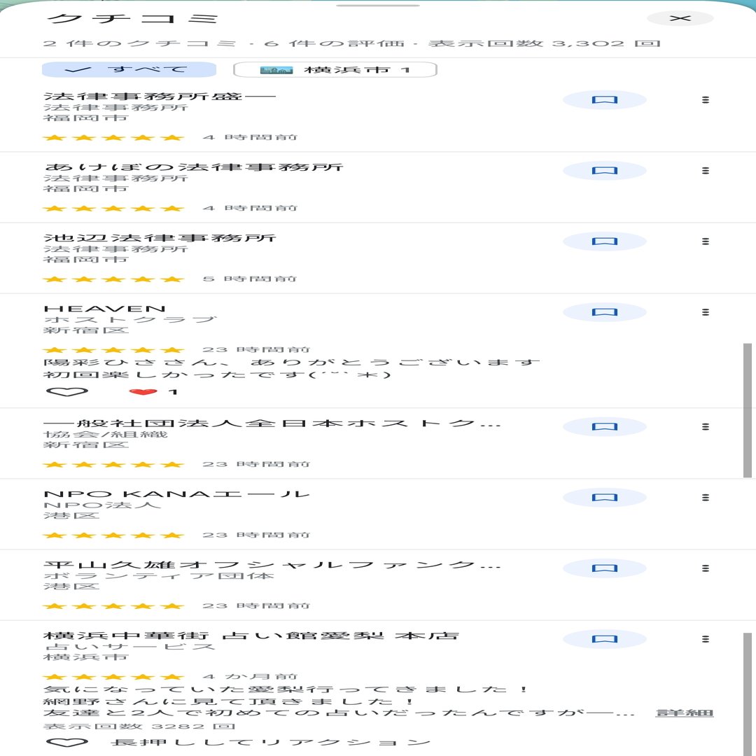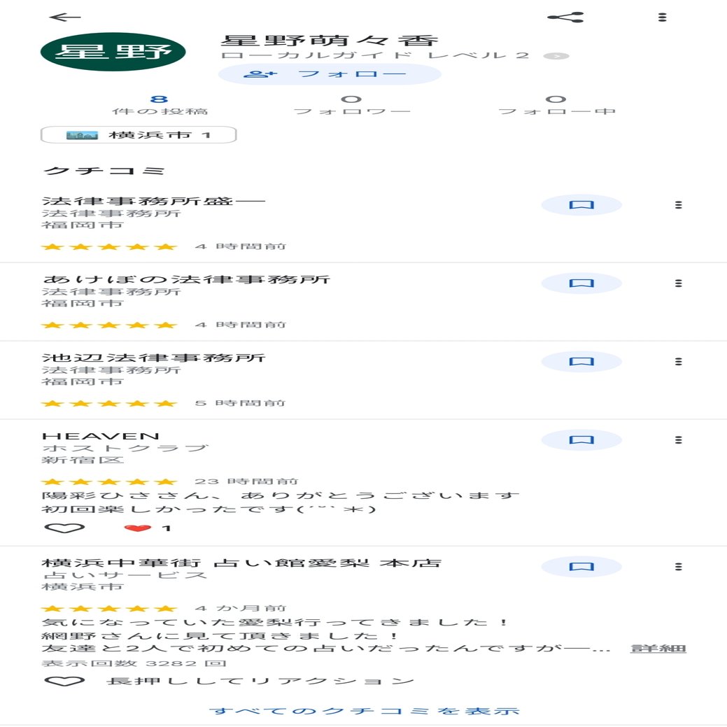 以下のスクショは2025年6月16日17時30分頃のものである。星野萌々香さんがあけぼの法律事務所、池辺法律事務所、法律事務所盛一、ホストクラブHEAVENに一気にレビューを書いている。これは他のアカウントと同じくとても怪しい。なぜここまで複数のアカウントが福岡市の法律事務所と新宿のホストクラブに訪れているのだろうか?こんな偶然は普通は起こらない。
