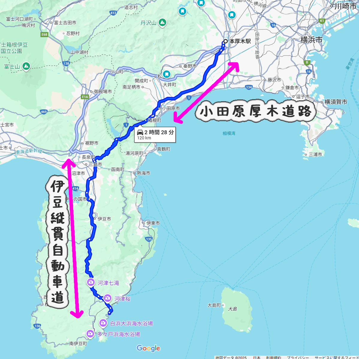 厚木方面から向かう場合、2つの有料自動車道を用いることで、かなりスムーズに移動できた。高速道路よりもちょい安(片道1000円くらい)な代わりに一車線の道も多かったので、時間帯選べば快適そう。