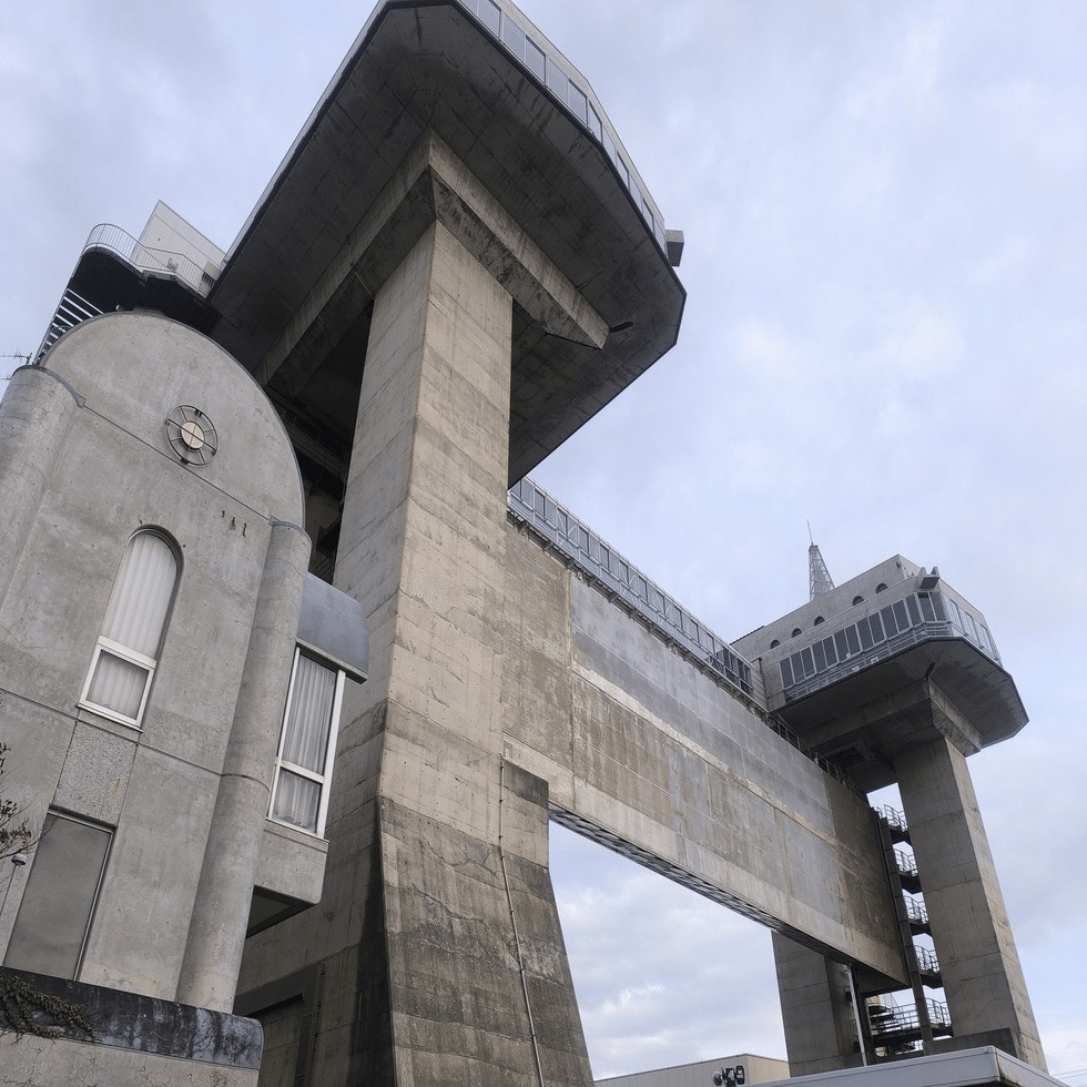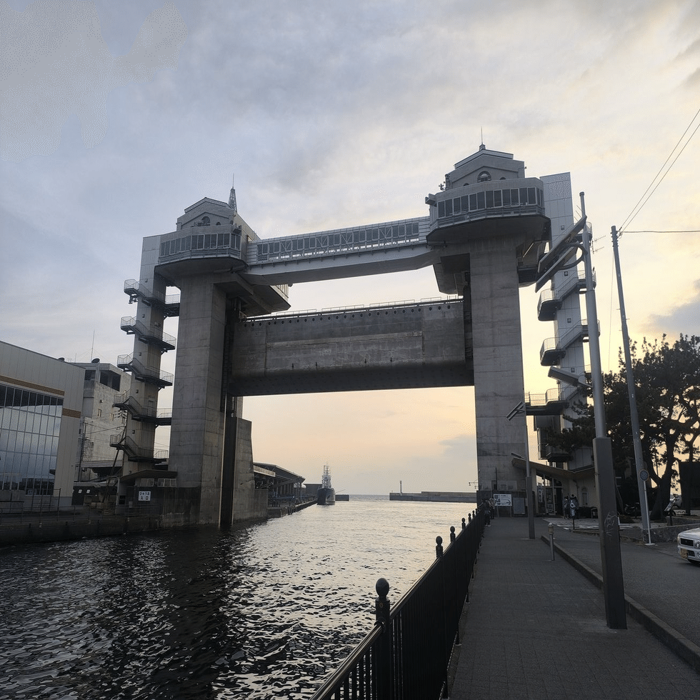 この水門は沼津港大型展望水門「びゅうお」であり、有事の際には中央の柱がおりてきて津波などが川に流れることを防ぐという。