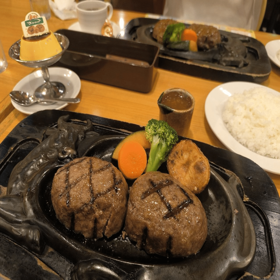 ハンバーグは牛肉100%のミディアムレア(じっくり焼きにもしてもらえる)で「めっちゃ肉!!」って感じで疲れた体に染み渡る。