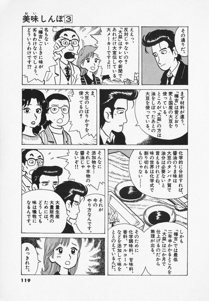 マンガ美味しんぼで知った日本人の8割は「ニセモノ醤油」を使ってる。 - ノーネクタイのMy Way恥ずかしながら、日本の醤油のほとんどが大豆の搾りカスでつくられている事実をマンガの「美味しんぼ」で10年ほど前に知った。醤油は日本の伝統的な調味料で大豆と小麦を使って発酵させて造るモノとばかり思っていた。しかし、実際には第2次世界大戦の開戦前の1940年に大豆の不足によって「大豆の搾りカスで醤油を造る」という国による指導が行われ、その製法は物資不足が続いた戦後にも引き継がれて醤油は「大豆の搾りカスで造る」という方法が現在では当たり前になってしまったのだ。その一方で、地方にある小さな醤油製造会社は、昔からの丸大豆と小麦を使った伝統的な製法を守りながら醤油を造り続け醤油本来の「味」を守り続けている…www.gunjix.com自分の身内だったらと考えるとこわいを超えたこわい