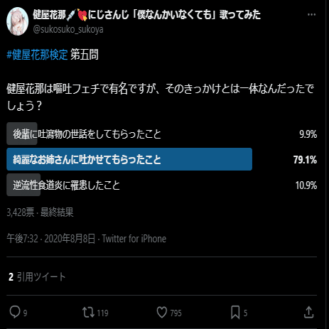 健屋花那さんは配信にて「嘔吐フェチ(嘔吐行為に対しての性癖嗜好がある)」と公言されております。