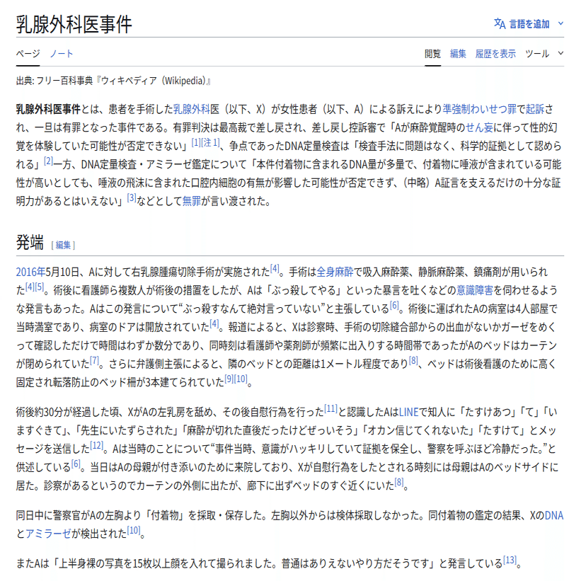 2016年に、乳腺外科医の先生が、Aという乳がんの患者に対し手術を行いました。その術後に乳腺外科医の先生が当該Aの病室を訪室し、あろうことかAの(手術部位ではない)左乳房を舐め、その場で自慰行為をした、というものです。只これは一種の「術後せん妄(一時的な意識障害で当該行為は行われていないとされる)」であると考えられ、第一審では無罪判決になりました。