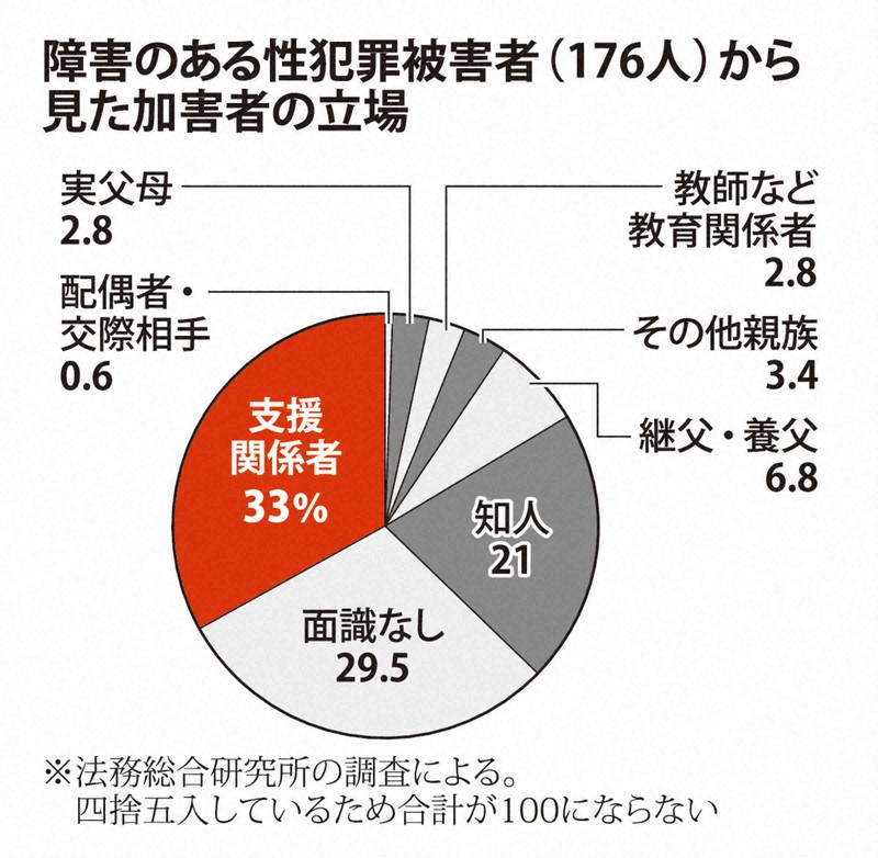 障害者が被害者のケースでは、加害者は支援関係者が33%と最多で、面識なし29・5%、知人21%――と続いた。障害がない人の場合は「面識なし」が最も多く、16歳未満で40・2%、16歳以上だと70・3%に上った。