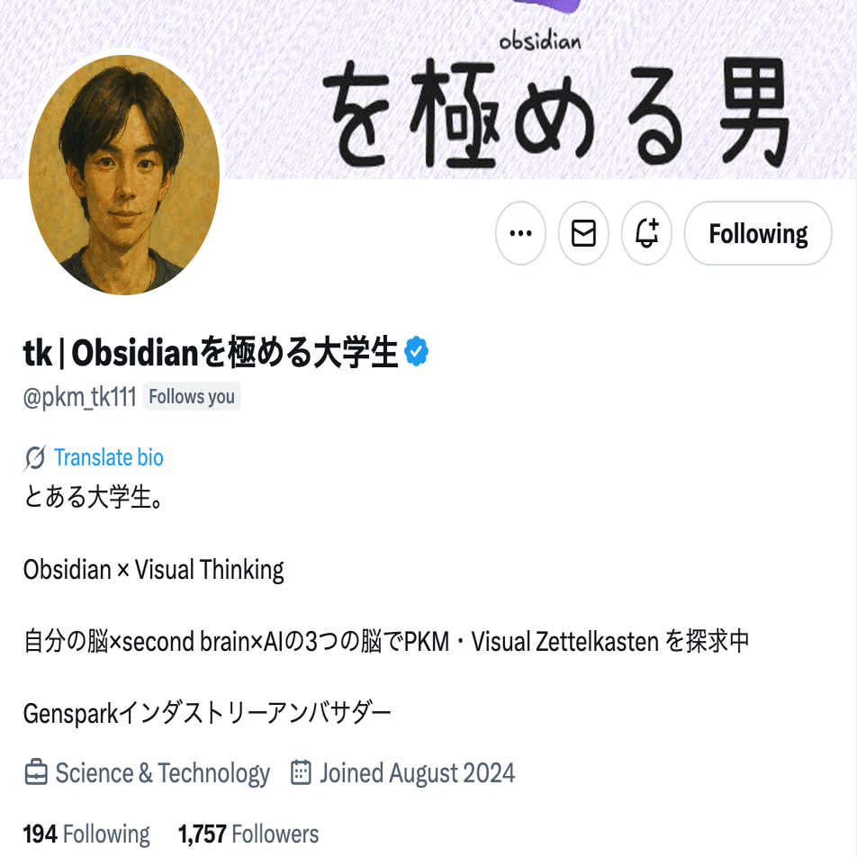 大学で経済学を学びながら、自分の勉強や研究の中で徹底的にObsidianを使いこなし、“第二の脳”として活用している方。単なる操作方法ではなく