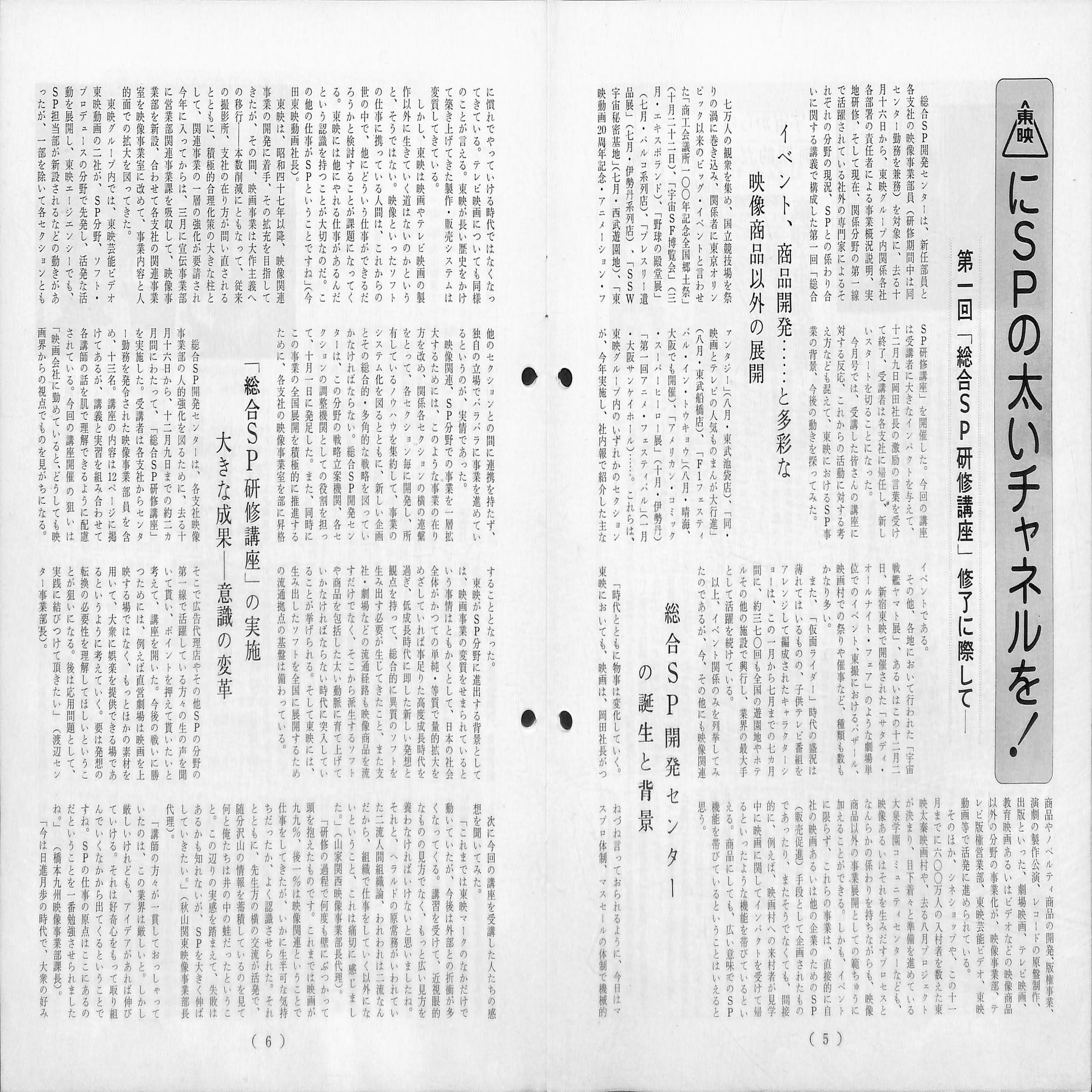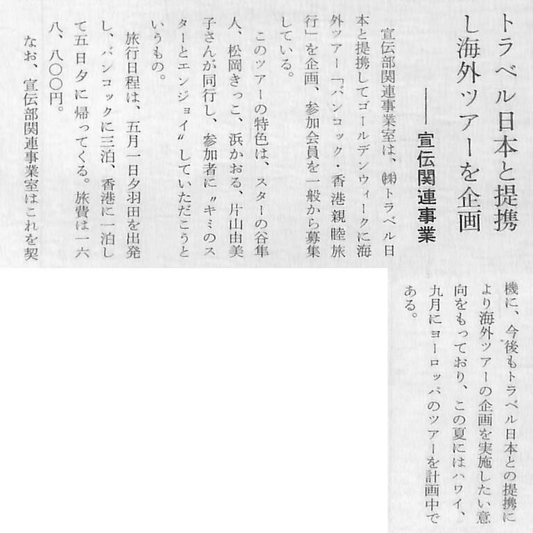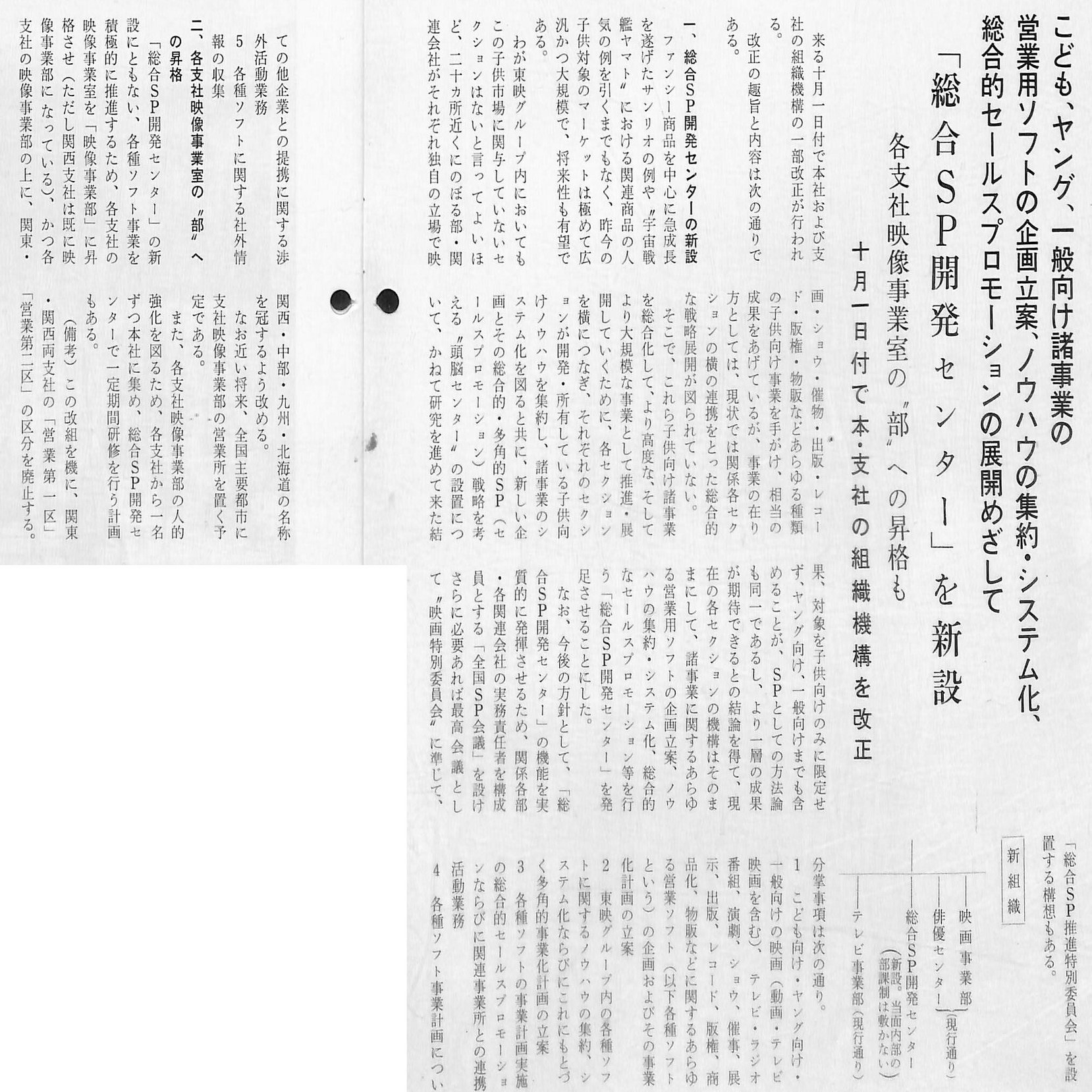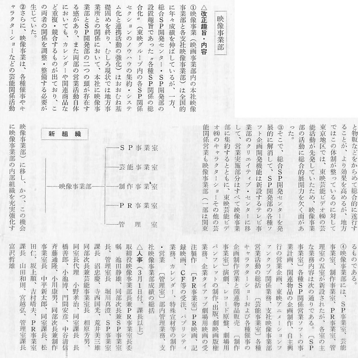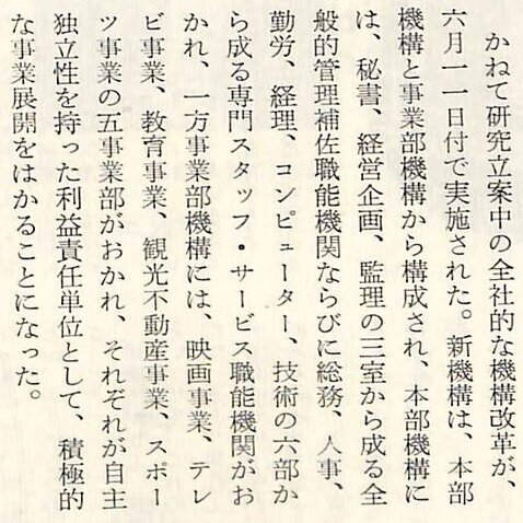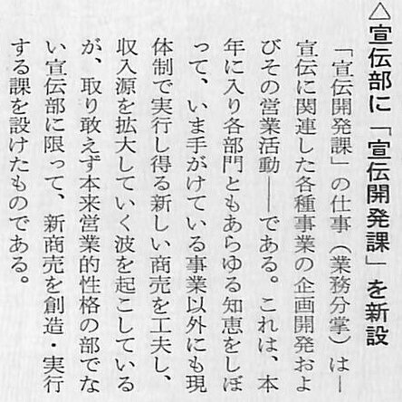 6月には全社の機構改革を行い、事業部制を導入。これに伴い「宣伝部・宣伝開発課」は「渉外業務課」を統合して、「宣伝部・関連事業室(池田静雄部長兼室長)」となりました。