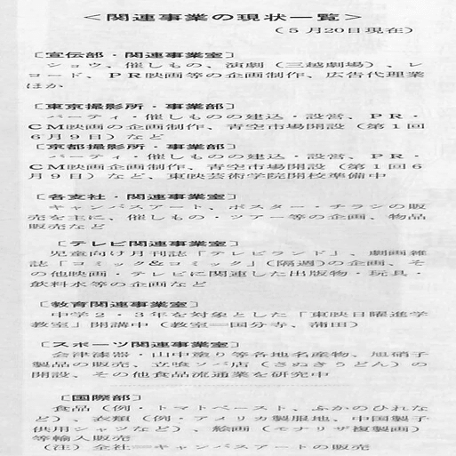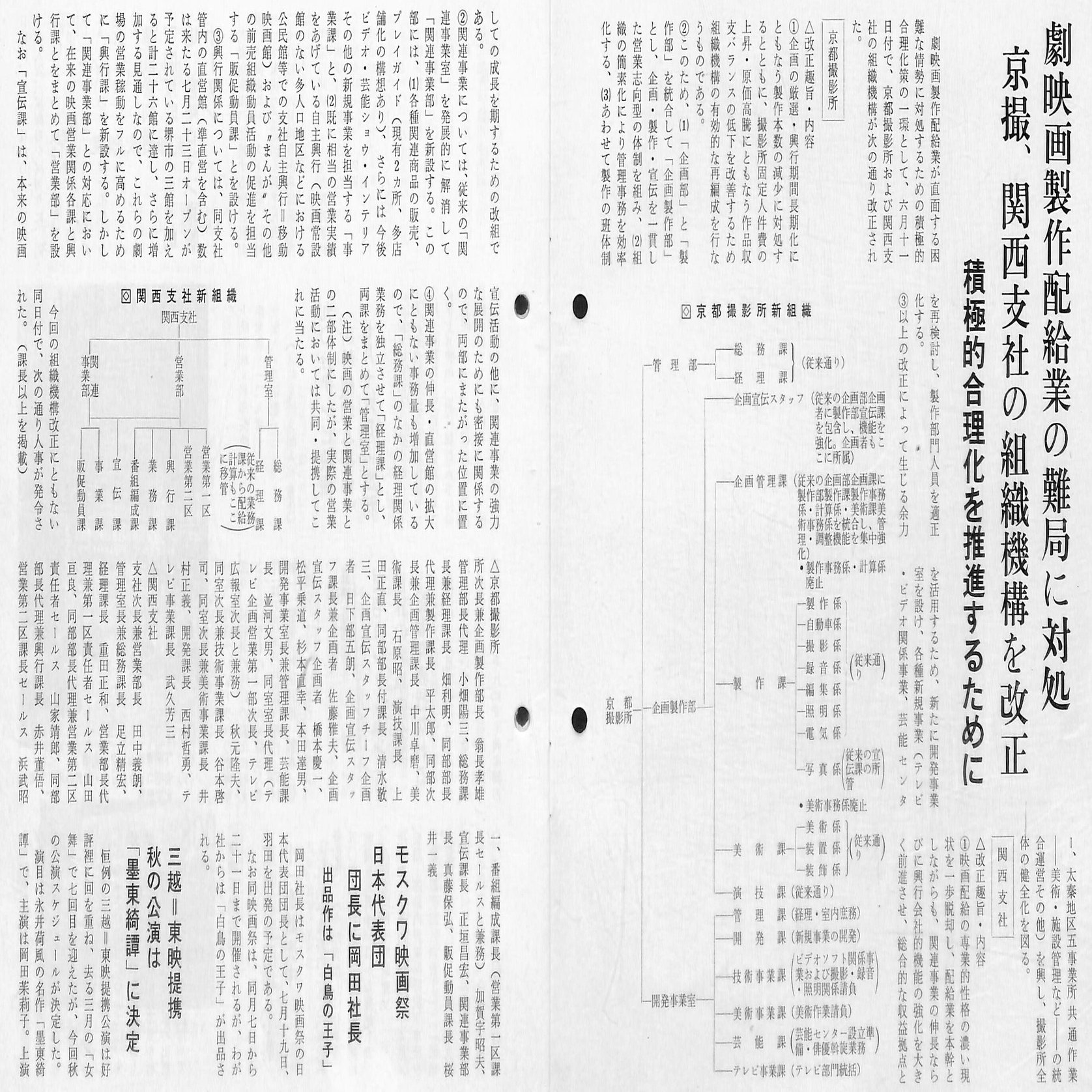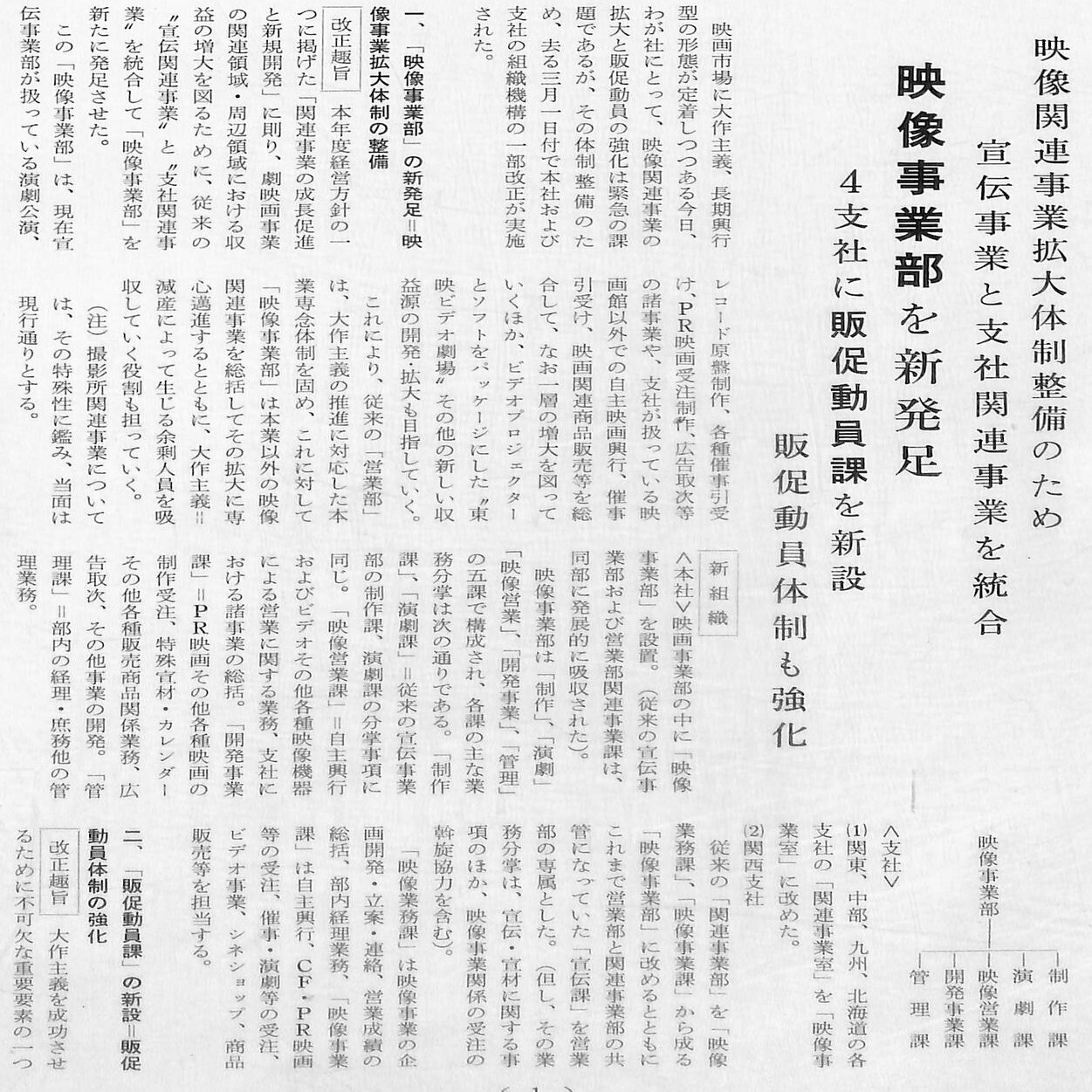 関東、中部、九州、北海道各支社の「関連事業室」は「映像事業室」となり、「関西支社」では従来の「関連事業部」を「映像事業部」に改め、映像事業の管理・連絡を行う「映像業務課」と自主興行、PR映画・CM制作の受注、催事演劇等の受注、ビデオ事業、シネショップ、商品販売等を担当する「映像事業課」を置きました。