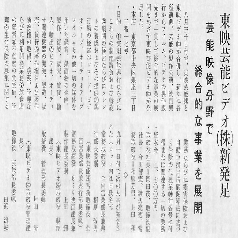 1977年8月、「東映芸能」は「東映ビデオ」と合併し「東映芸能ビデオ株式会社」となります。