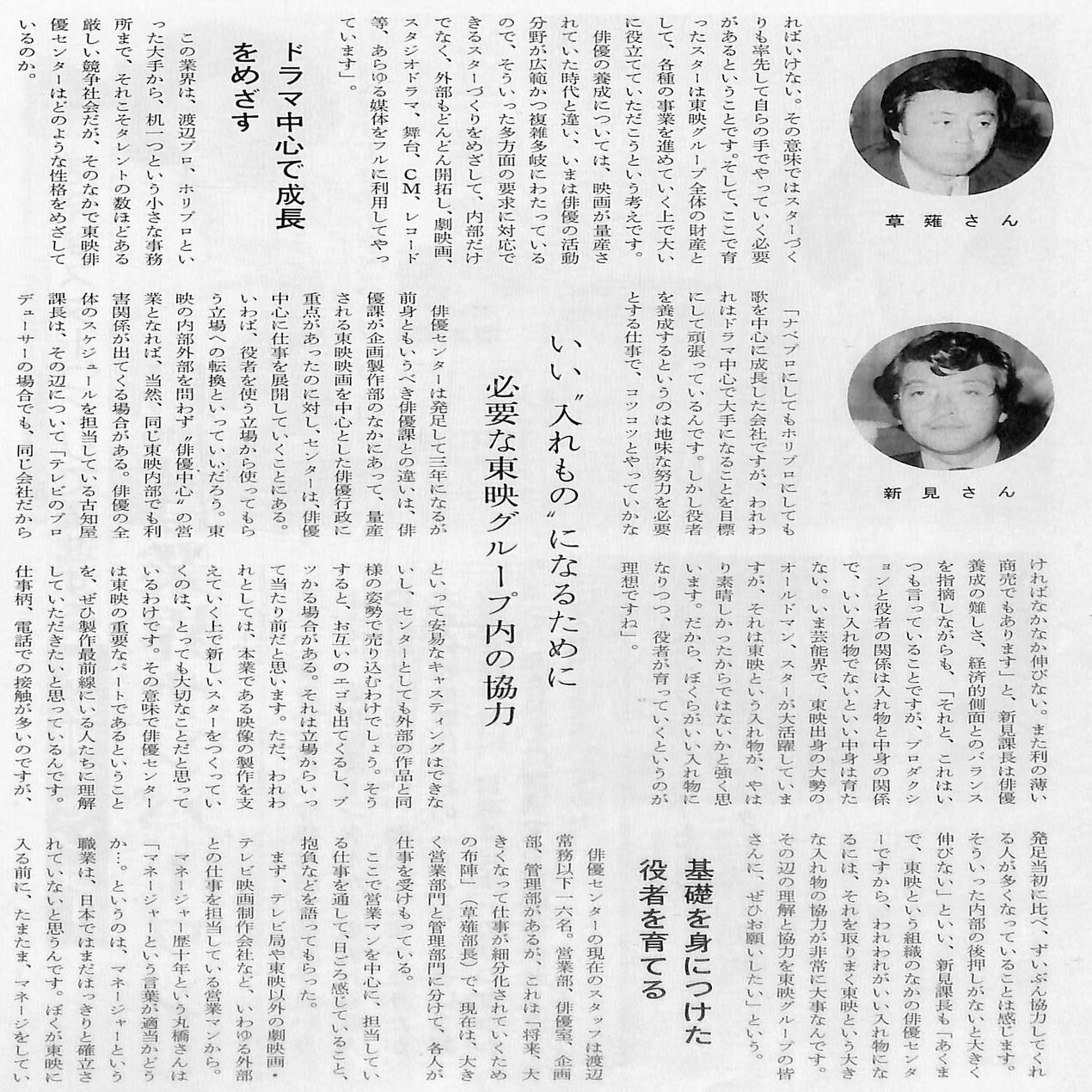 1977年8月1日に「宣伝部・関連事業室」は独立、「宣伝事業部(池田静雄部長)」となり、新たに「俳優センター(取締役渡辺亮徳部長)」を独立の部として設置しました。