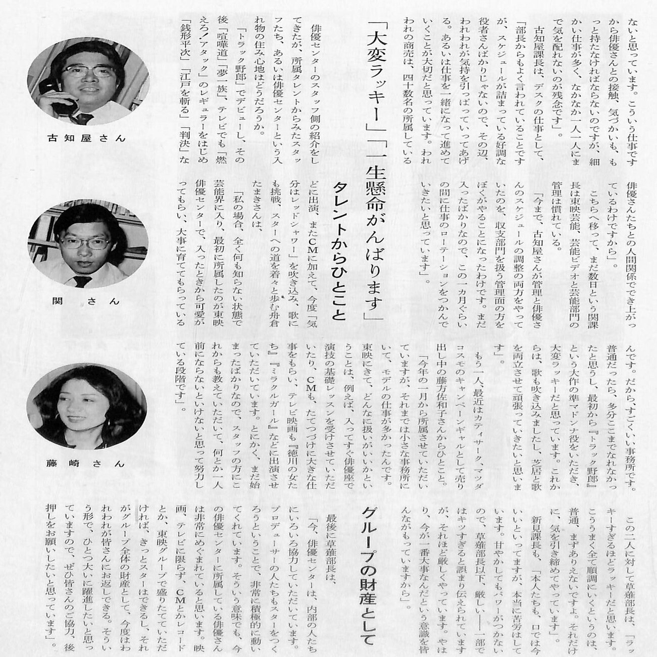 1965年に発足した「東映芸能」は「東映ビデオ」と合併した後、1980年3月に芸能部門が「映像事業部」に移管され、「映像事業部芸能事業室」となります。