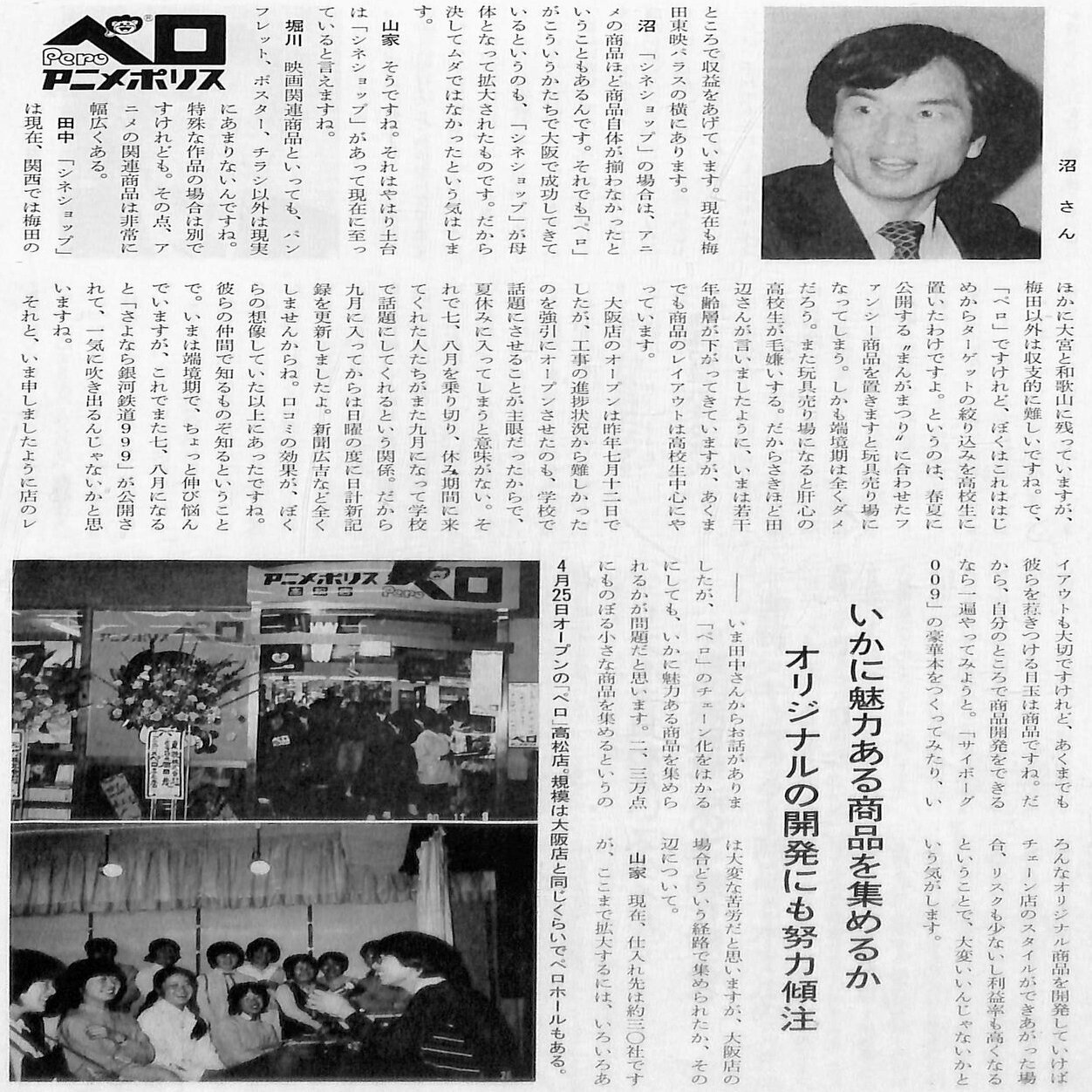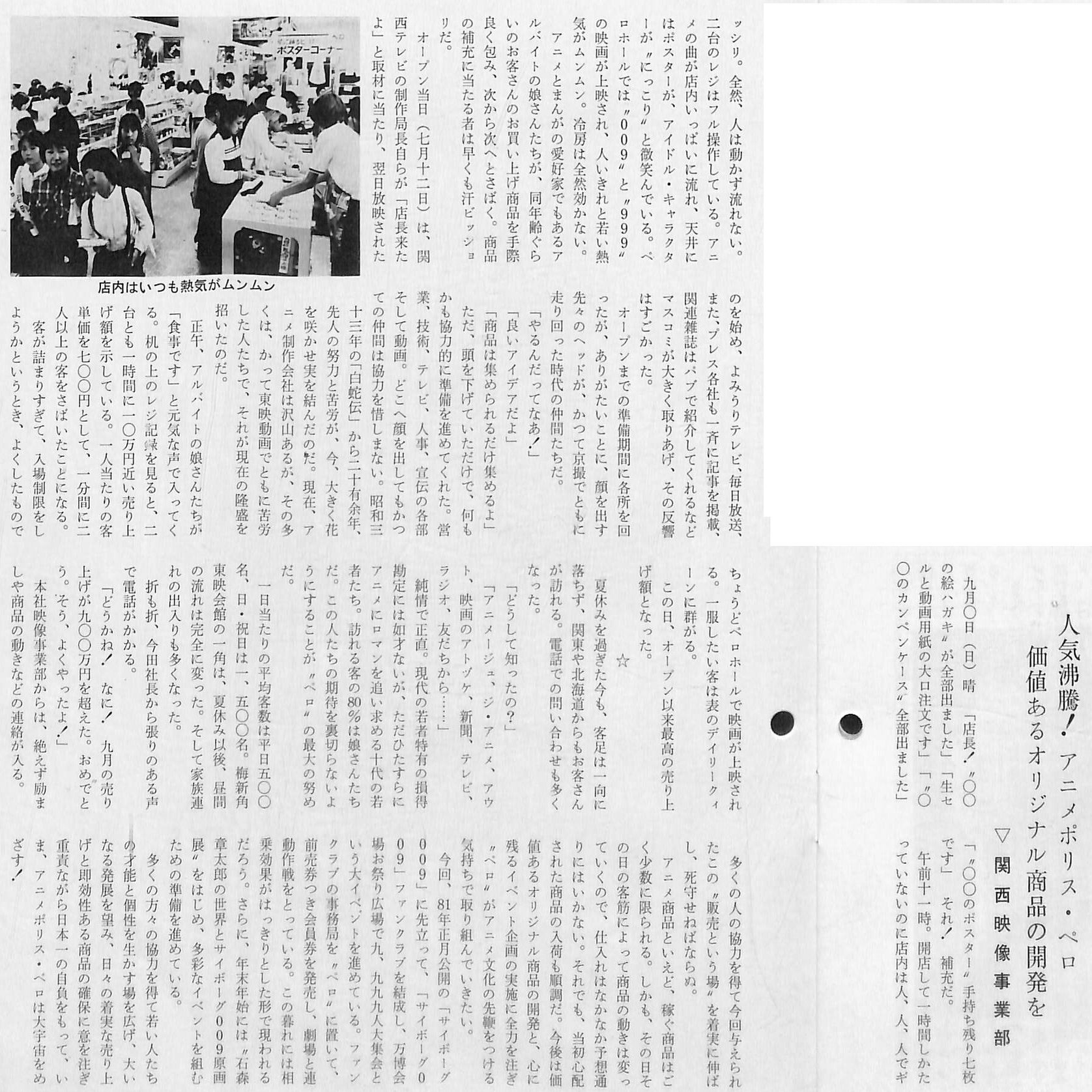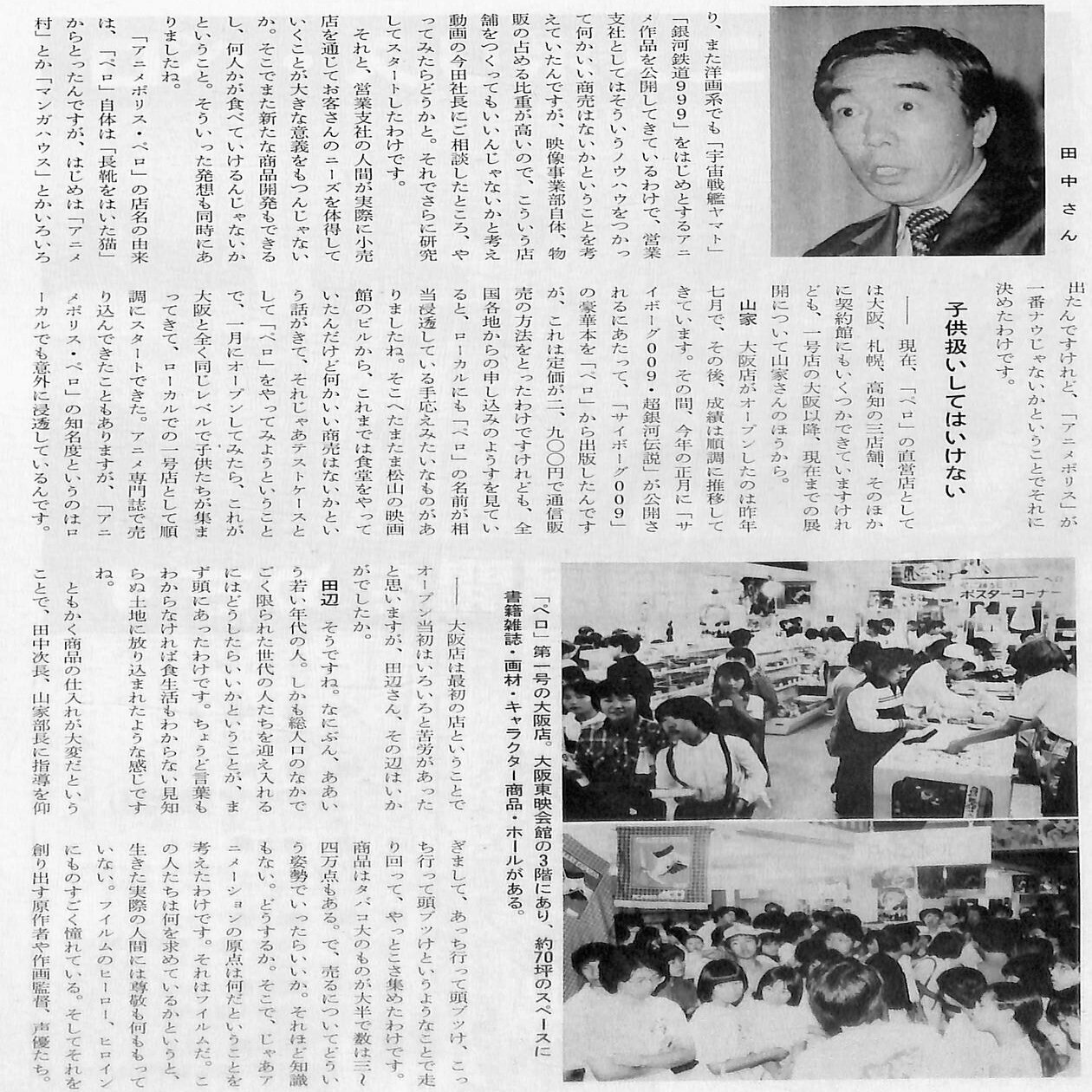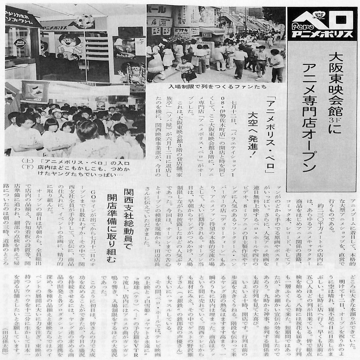 大阪東映会館1階で「東映シネ・ショップ」を展開する「関西支社映像事業部」は、この動きを捉え、1980年7月12日、大阪東映会館3階に大型アニメグッズショップ「アニメポリス・ペロ」を開店しました。