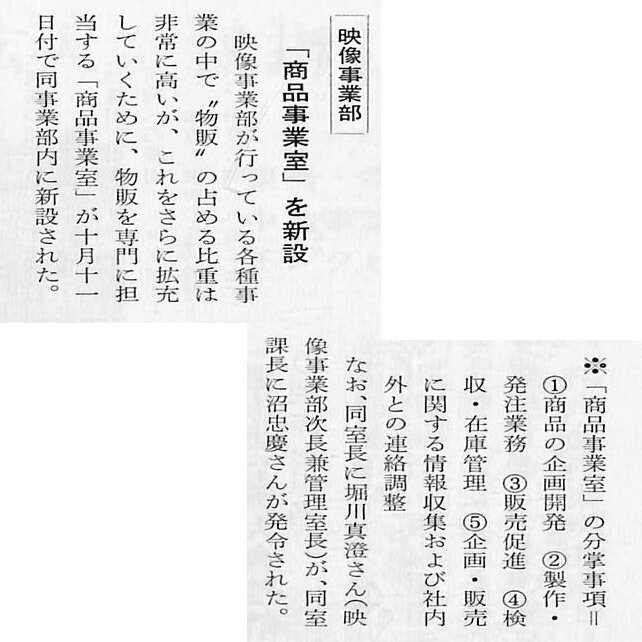 1980年10月、アニメグッズの好調を受け、「本社映像事業部」に物販を専門に担当する「商品営業室」が新設されます。