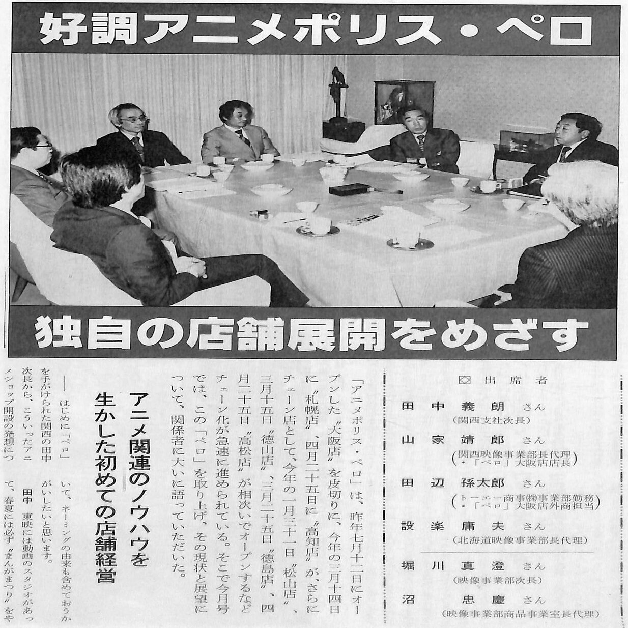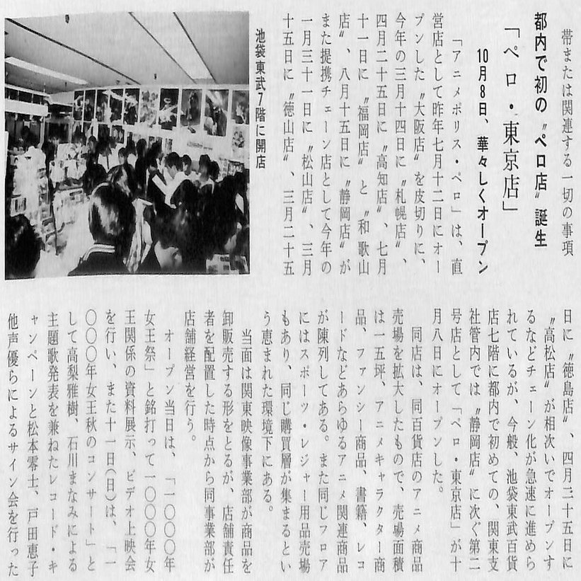 この年「アニメポリス・ペロ」は、新たに東映直営店舗として札幌店、滝川店、仙台店、東京店、横浜店、静岡店、豊橋店、高知店、福岡店、小倉店の10店舗とフランチャイズ店の松山店、徳山店、徳島店、高松店の4店舗、計14の店舗がオープンしました。