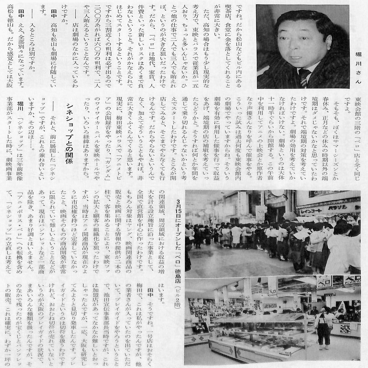 1978年に誕生した「映像事業部」は、劇場物販、自主興行、キャラクターショーとともに、劇場などの空スペースを活用した「シネショップ」「アニメポリス・ペロ」など店舗事業を全国で展開し、順調に売り上げを拡大して行きます。