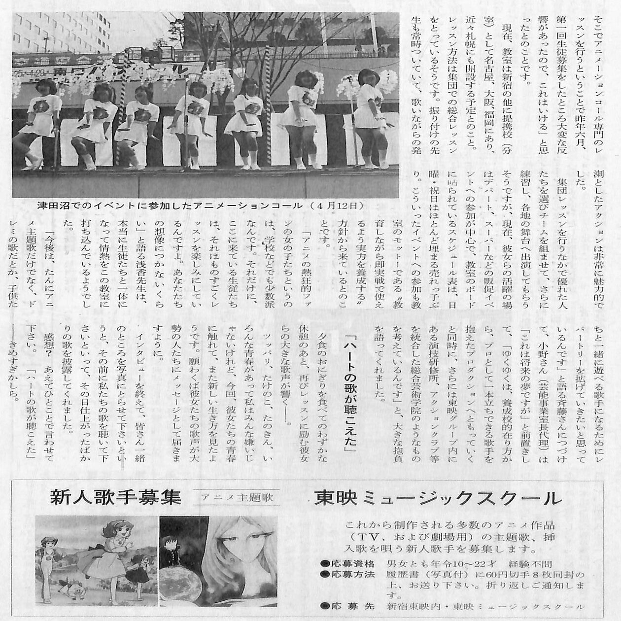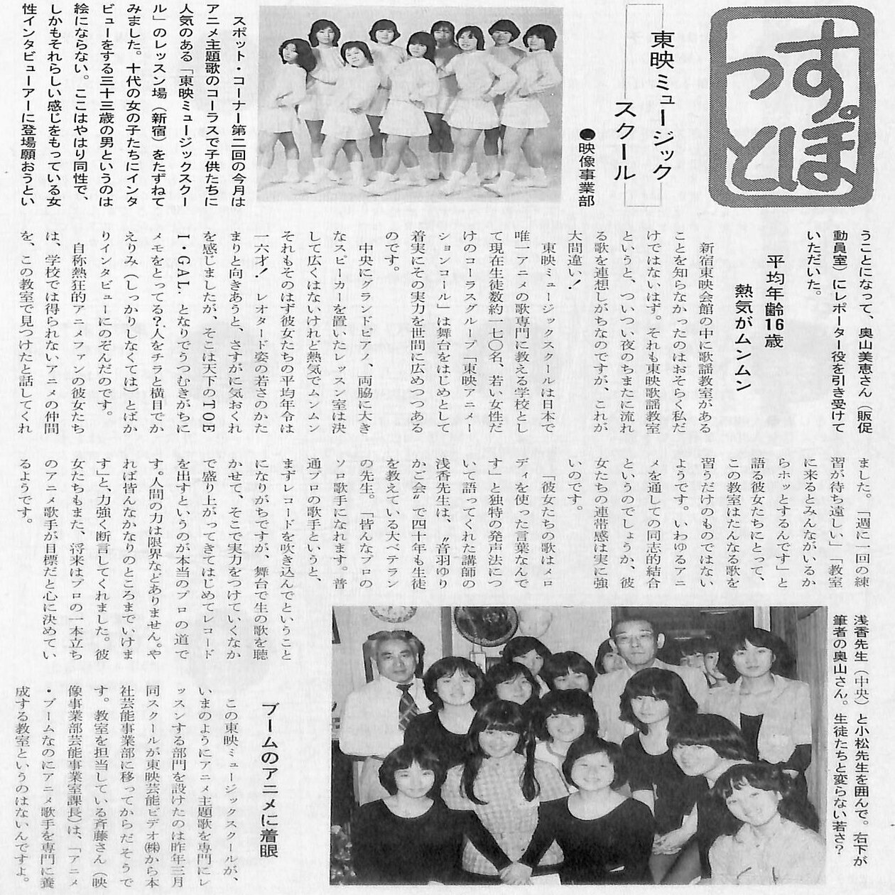 「映像事業部芸能事業室」は、1980年6月、「東映歌謡教室」から代わった「東映ミュージックスクール」にてアニメ歌手養成部門を立ち上げます。