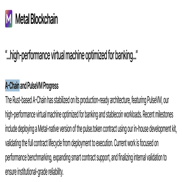 こうした進捗により、A-Chain/PulseVMは「プロダクション対応のアーキテクチャにおいて安定化した」段階に入ったとされています。なお「stabilized(安定化)」という表現は、開発中の仕様変更が収束し、リリースに向けて安定動作の検証・最適化段階に入ったことを示唆します。