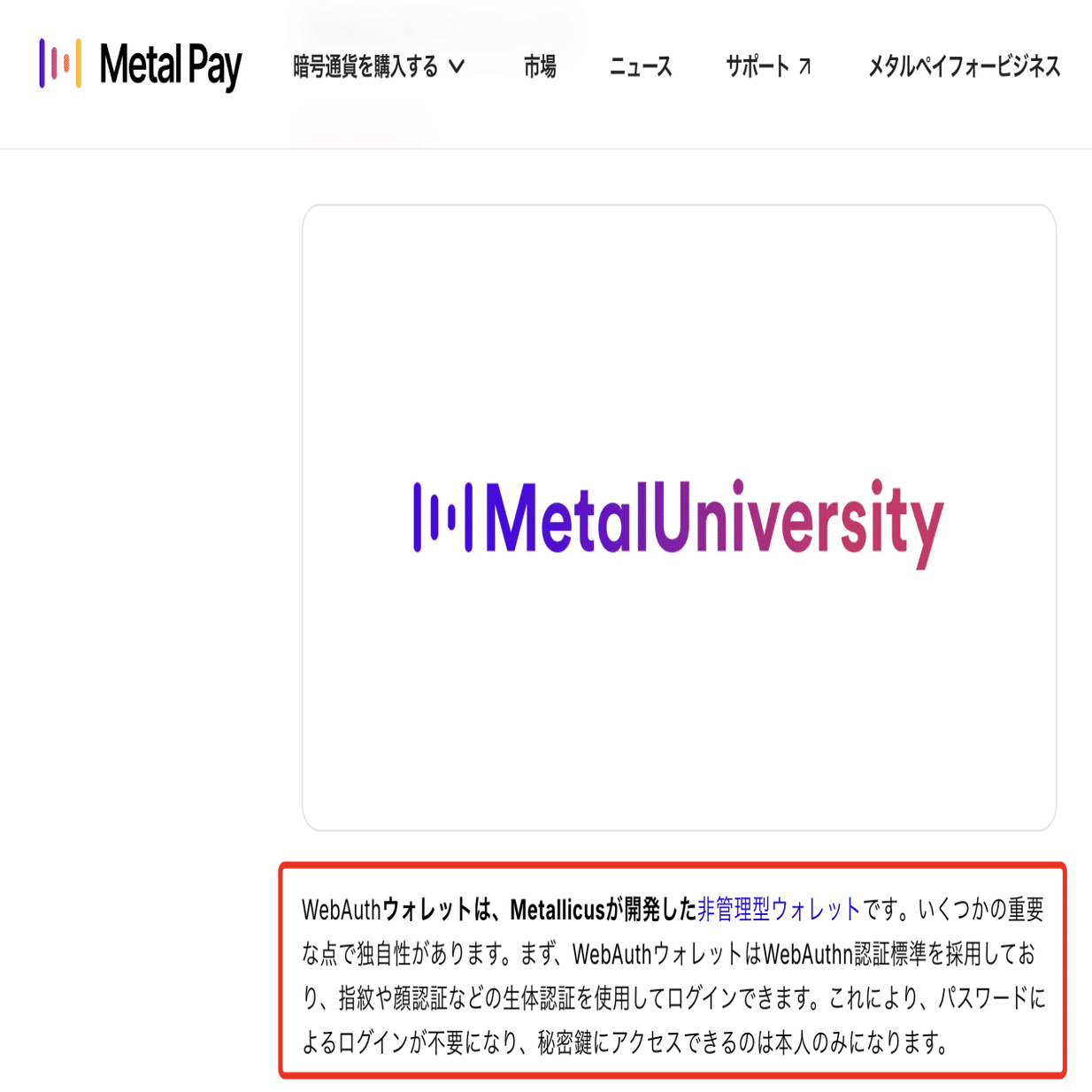 WebAuth WalletはMetallicus社が提供するセルフカストディ型暗号資産ウォレットで、FIDO2/WebAuthn規格を活用した生体認証ログインを特徴としています。