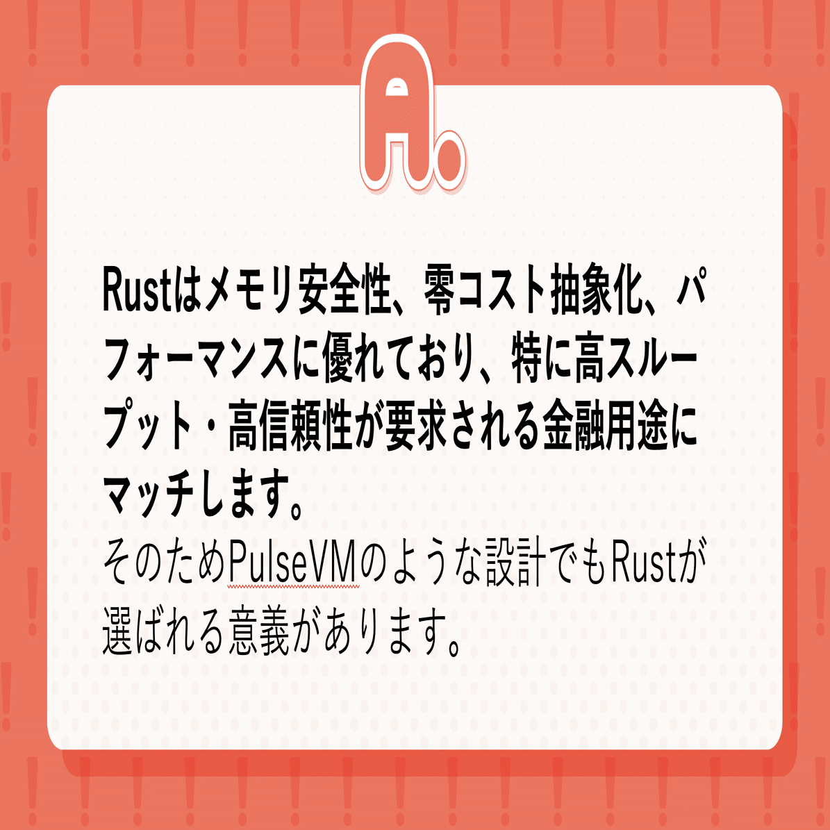 PulseVMはMetallicus社が銀行向けに開発中の高速スマートコントラクト用仮想マシンです。その実装はRust言語で記述されており、メモリ安全性や高性能性に優れています。