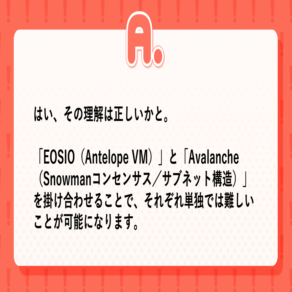 ・Avalanche側もSnowmanコンセンサスを武器にスケーラビリティとファイナリティを訴求しており、両者の方向性は合理的に一致している。EOSIOの柔軟なアカウント/権限モデルとAvalanche Snowmanを掛け合わせることで、過去資産互換性を維持しつつ金融規格適合の新基盤が成立した。