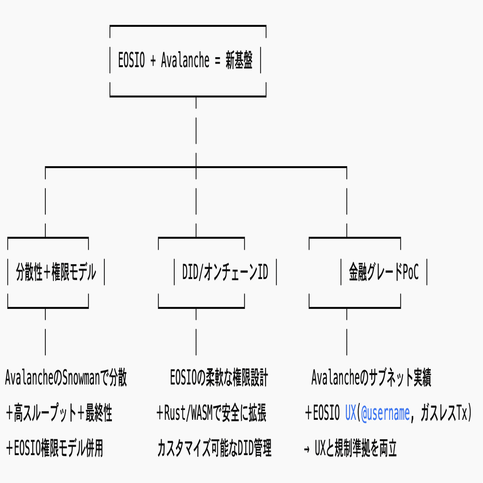 「EOSIO VM × Avalanche Snowman」だからこそ、柔軟な権限/DID管理と銀行グレードの分散性・スループットを同時に実現できる。
