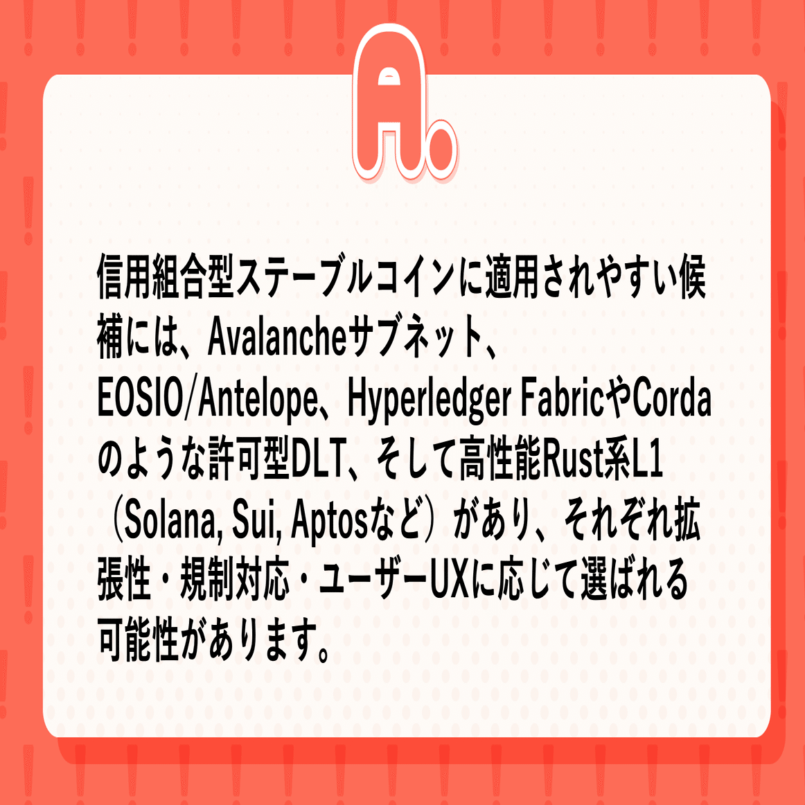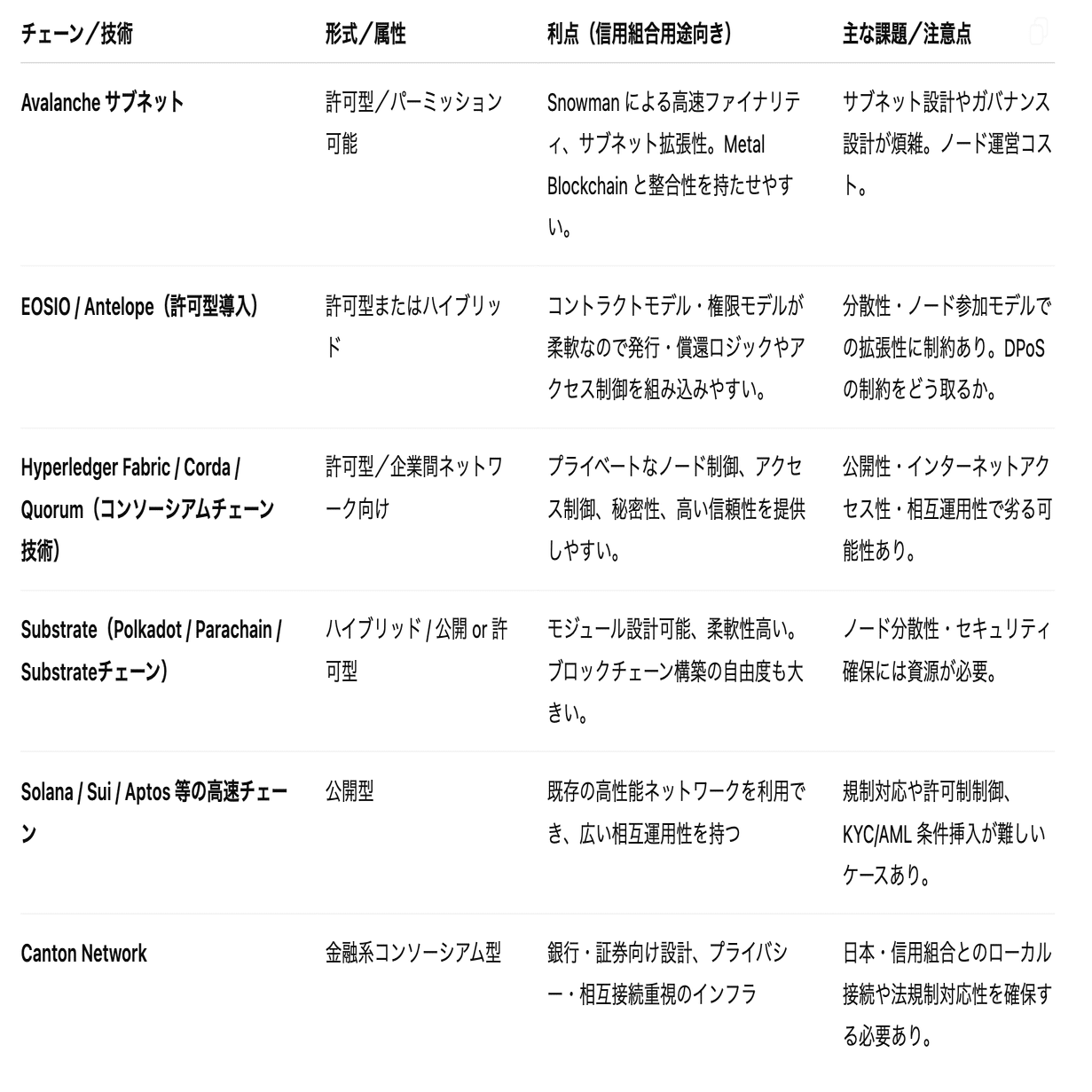 信用組合型ステーブルコインに使われる(または使われうる)チェーン・技術の例と、それぞれ優勢な点・課題を対比した一覧はこうなります。
